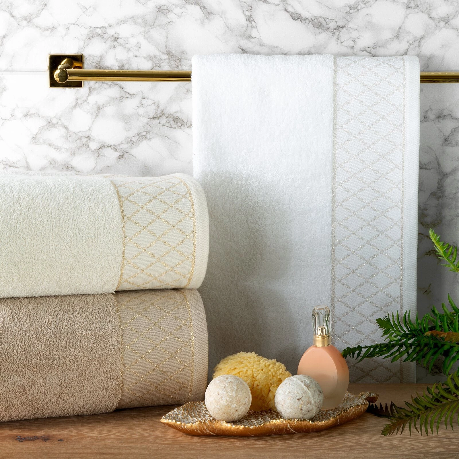 Ręcznik bawełniany z ozdobną bordiurą i błyszczącą nicią szerokość: 50 cm, długość: 90 cm, kolor: kremowy, Gramatura: 500 GSM, Skład: 100% bawełna; część ozdobna: 50% bawełna, 50% poliester