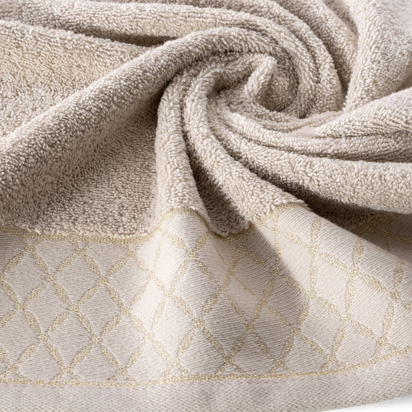 Ręcznik bawełniany z ozdobną bordiurą i błyszczącą nicią szerokość: 30 cm, długość: 50 cm, kolor: beżowy, Gramatura: 500 GSM, Skład: 100% bawełna; część ozdobna: 50% bawełna, 50% poliester