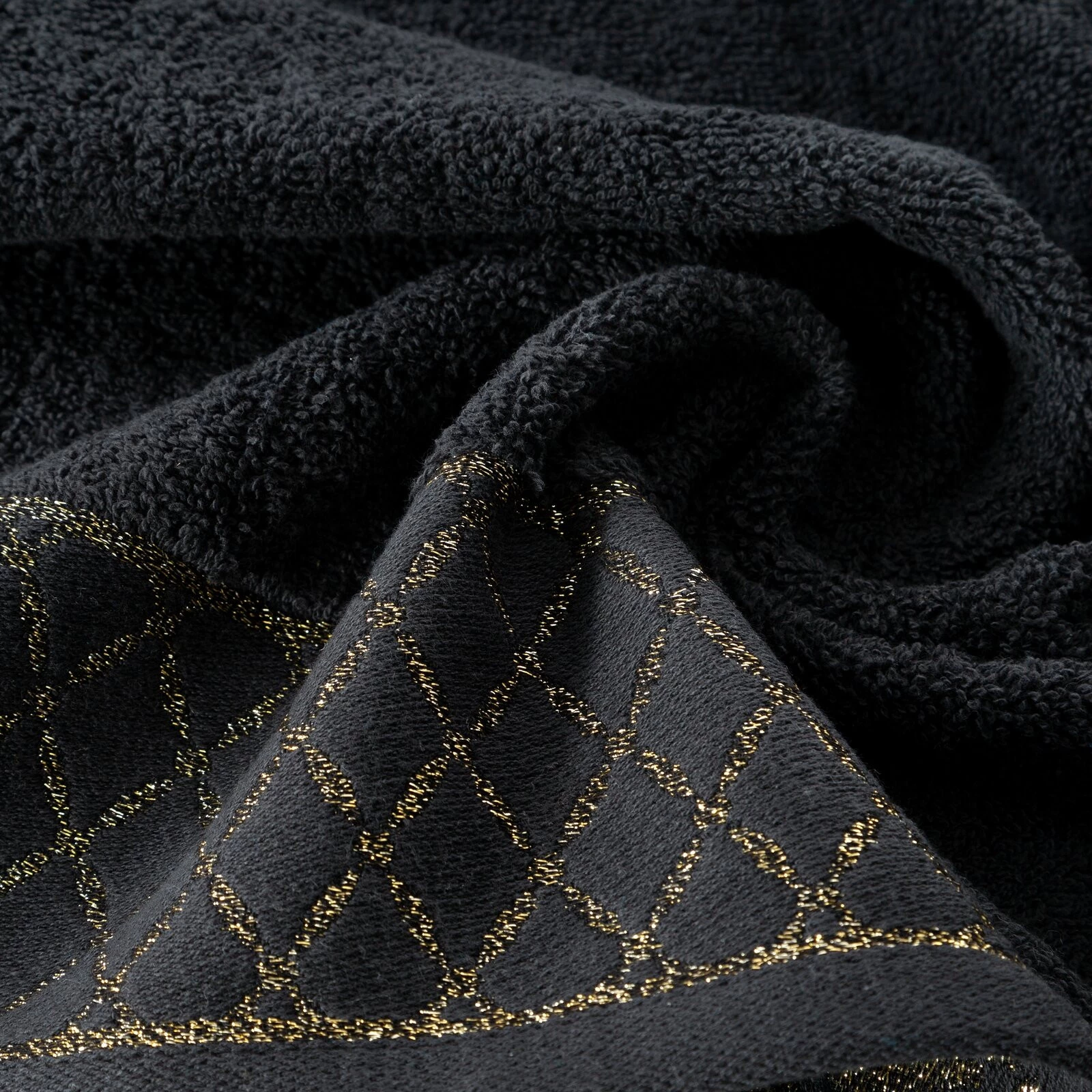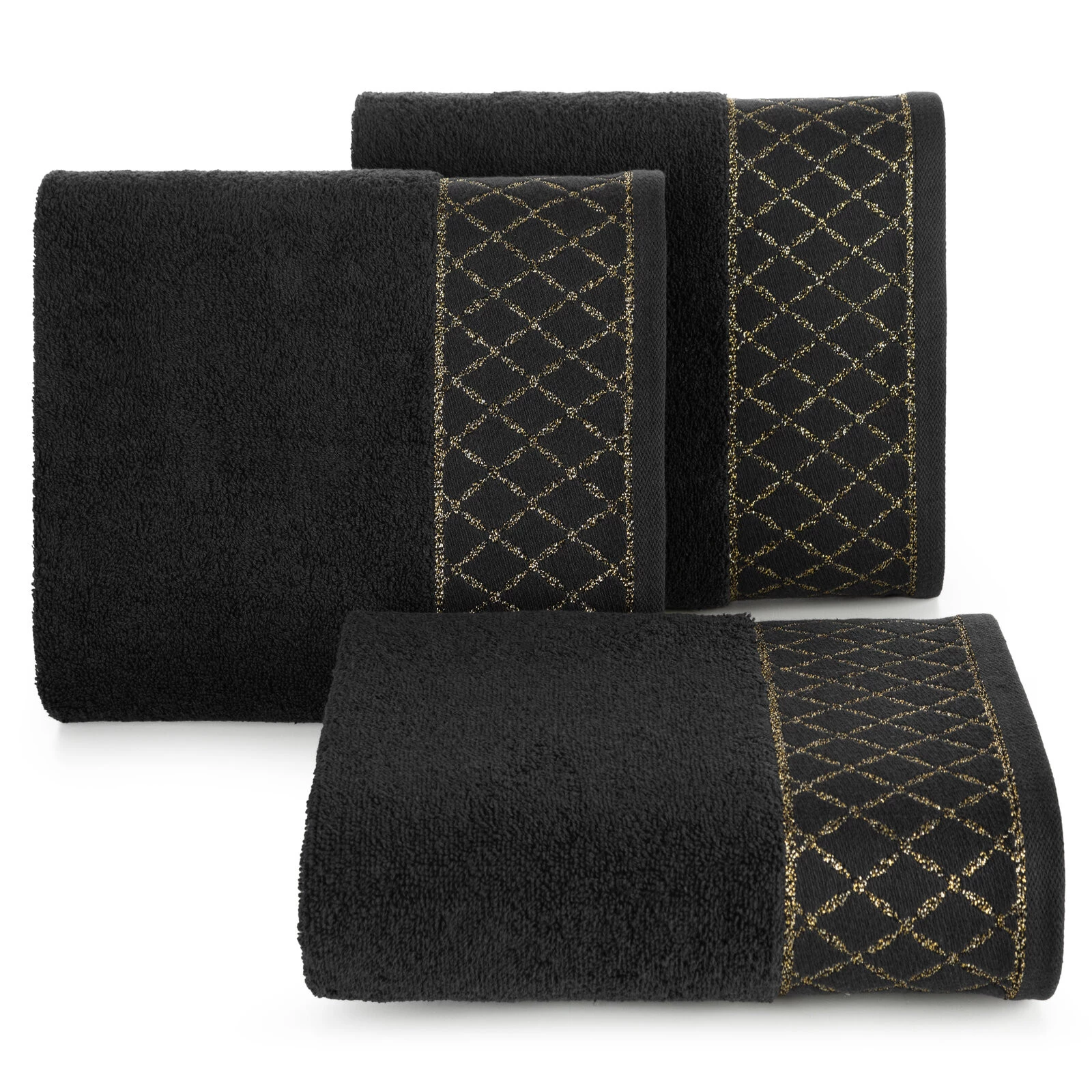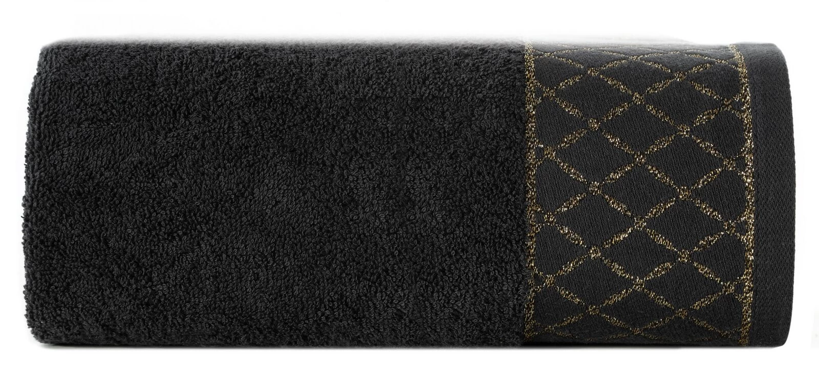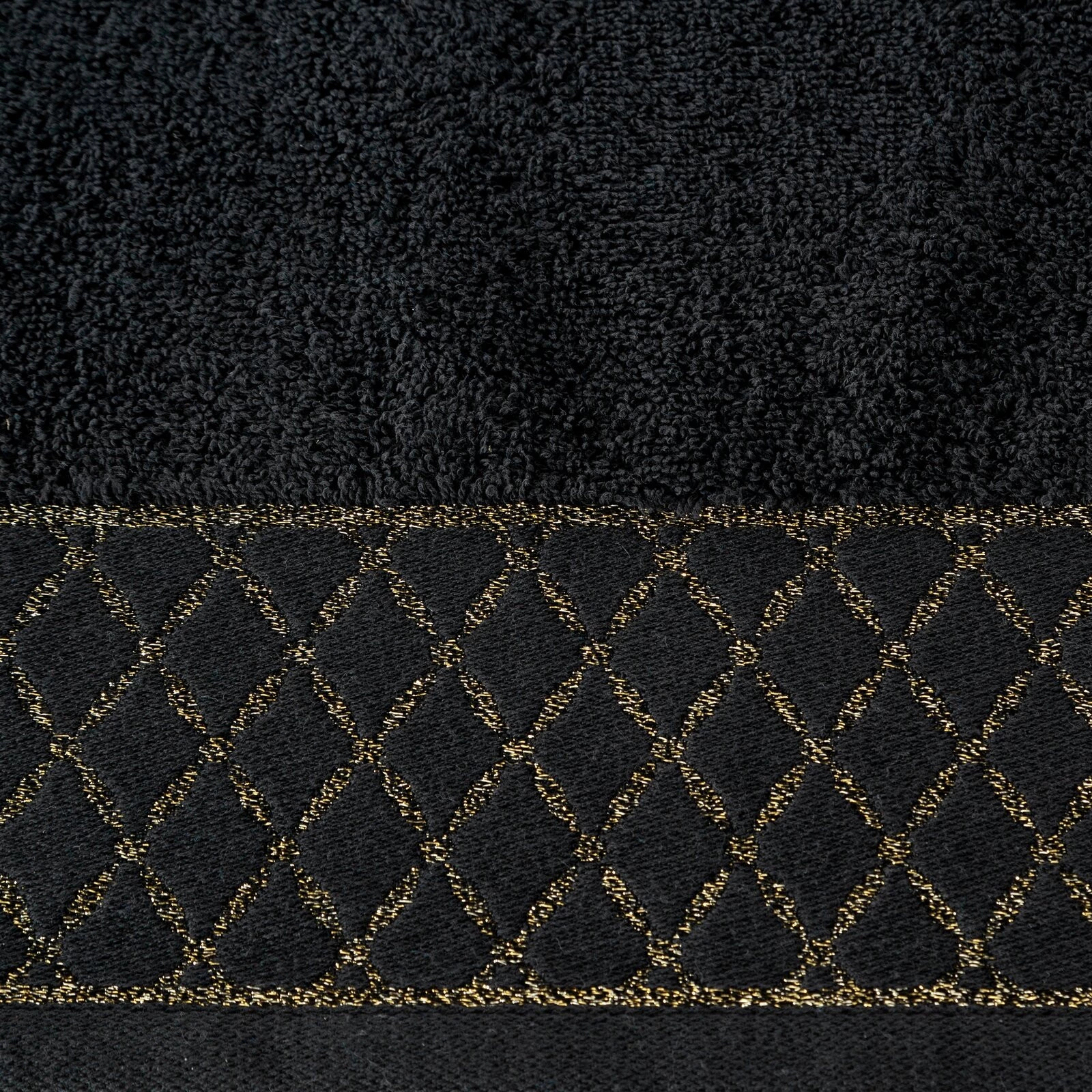Ręcznik bawełniany z ozdobną bordiurą i błyszczącą nicią szerokość: 30 cm, długość: 50 cm, kolor: czarny, Gramatura: 500 GSM, Skład: 100% bawełna; część ozdobna: 50% bawełna, 50% poliester