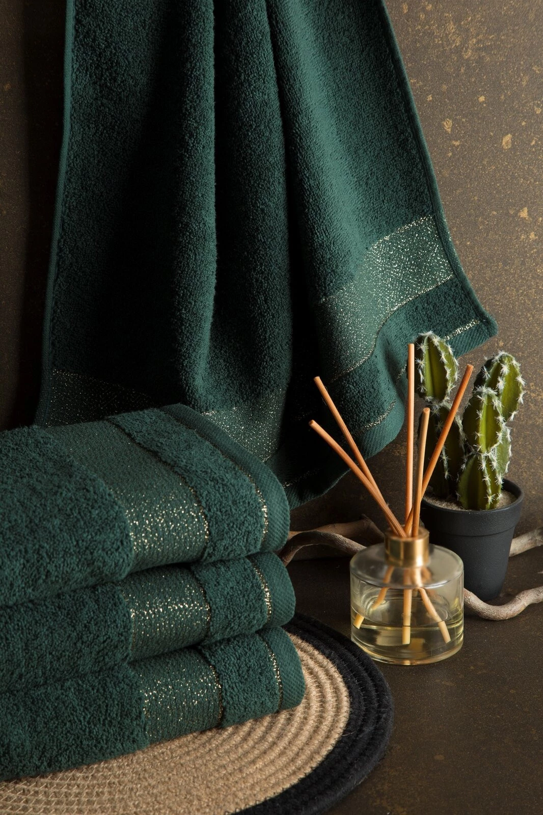 Jednobarwny ręcznik z miękkiej i chłonnej tkaniny bawełnianej o splocie frotte zdobiony kolorową bordiurą w stylu fastrygi. Łatwy w praniu, nie farbuje. szerokość: 70 cm, długość: 140 cm, kolor: stalowy, Gramatura: 500 GSM, Skład: 100% bawełna; część ozdobna: 50% bawełna, 50% poliester