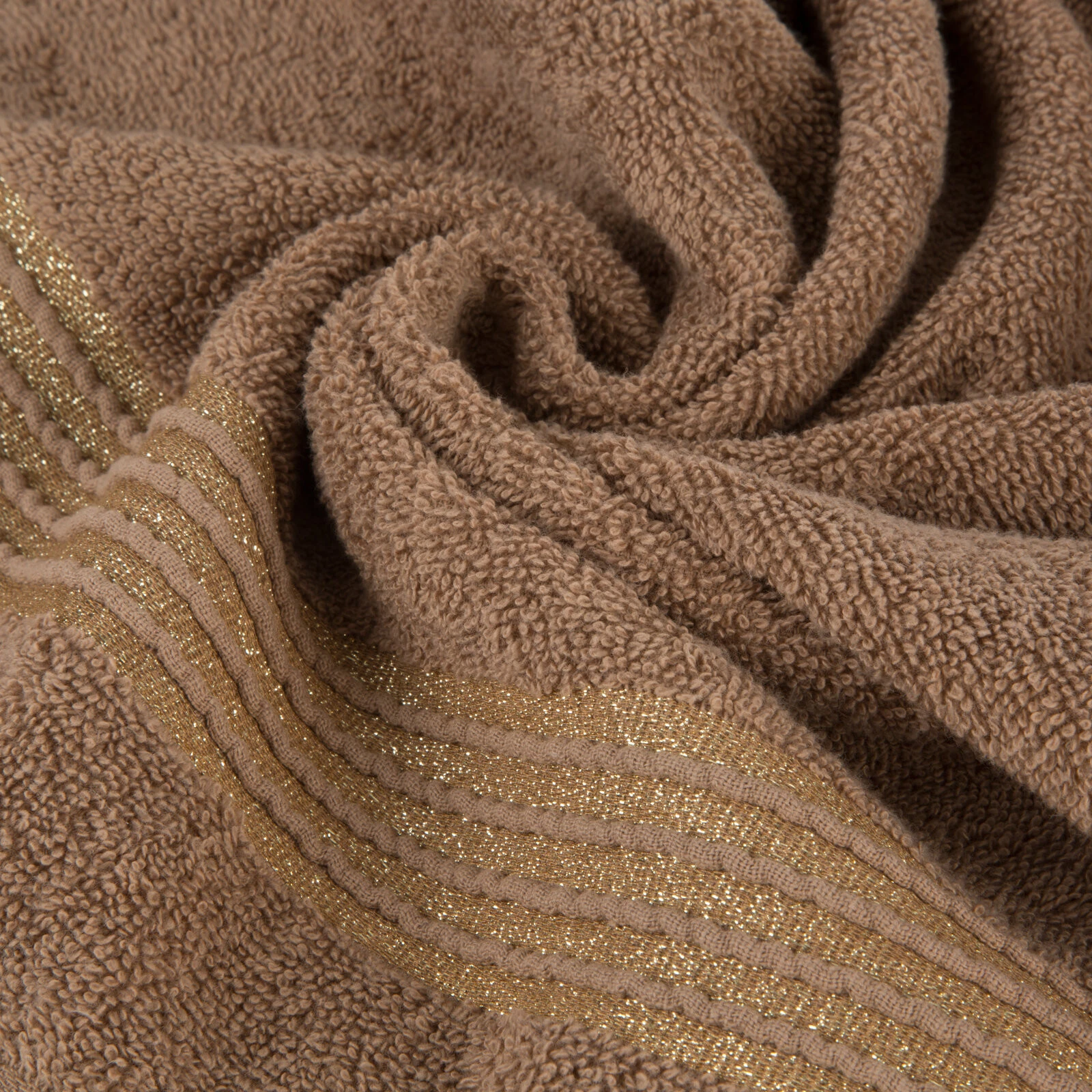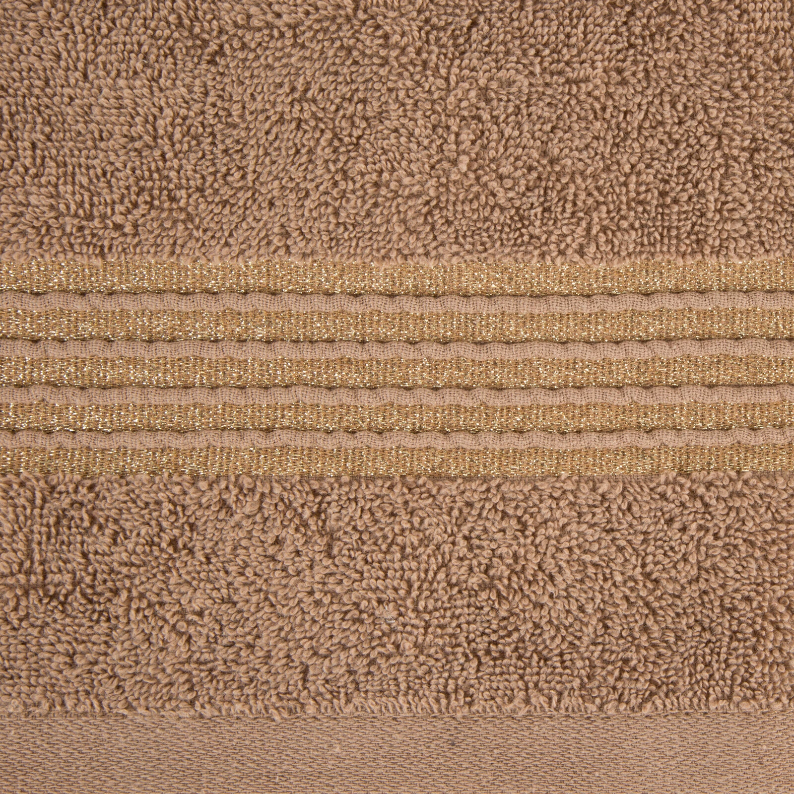 Ręcznik bawełniany z ozdobną bordiurą i błyszczącą nicią szerokość: 70 cm, długość: 140 cm, kolor: brązowy, Gramatura: 500 GSM, Skład: 100% bawełna; część ozdobna: 50% bawełna, 50% poliester