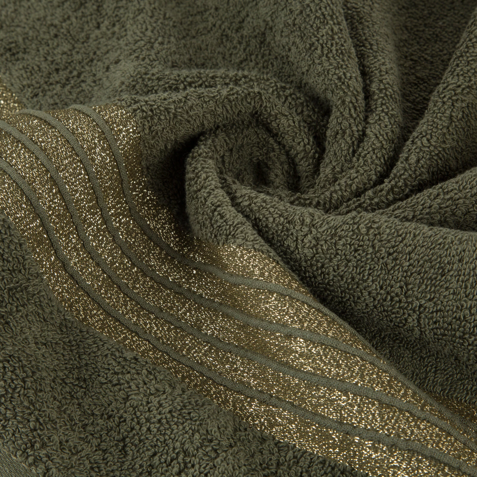Ręcznik bawełniany z ozdobną bordiurą i błyszczącą nicią szerokość: 70 cm, długość: 140 cm, kolor: oliwkowy, Gramatura: 500 GSM, Skład: 100% bawełna; część ozdobna: 50% bawełna, 50% poliester