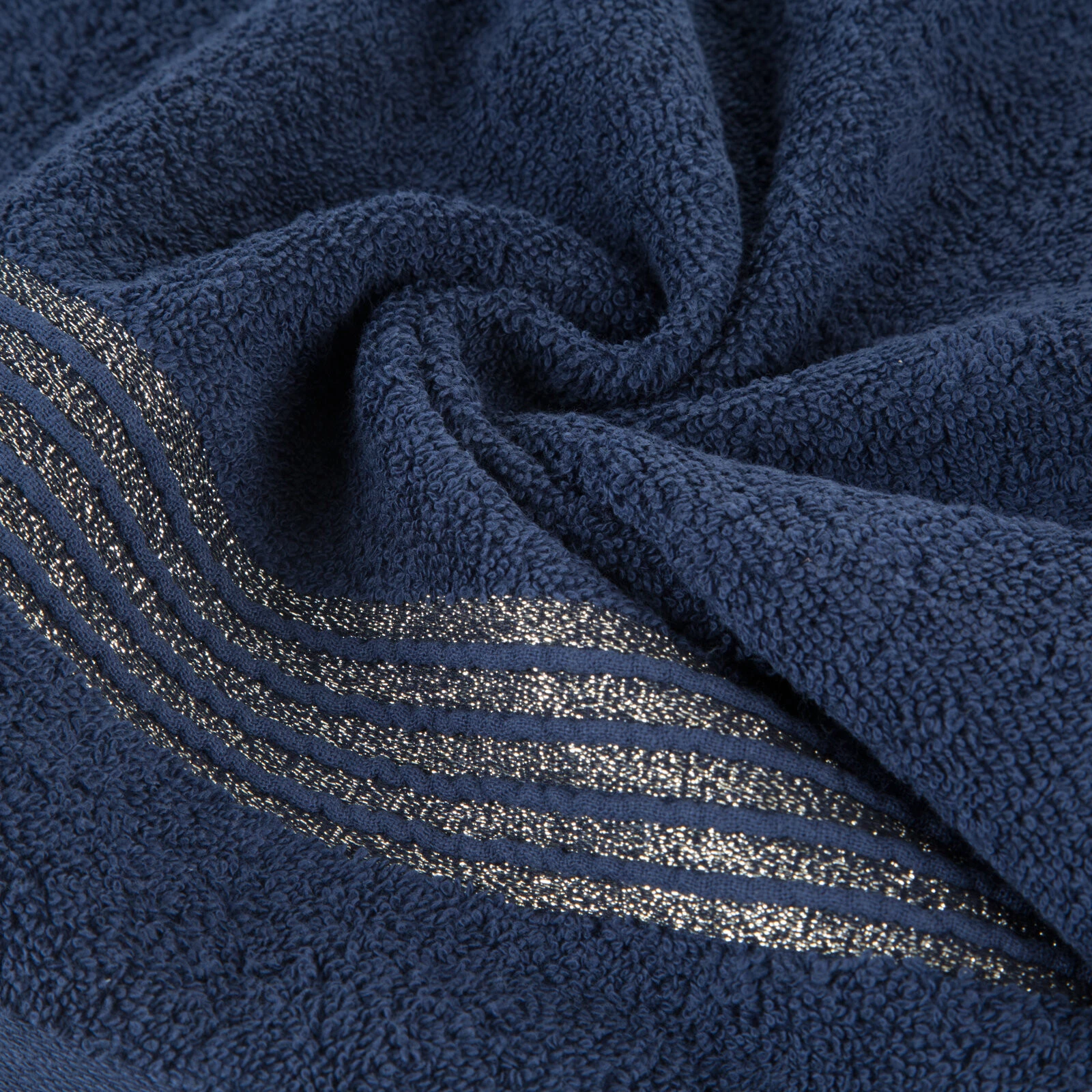 Ręcznik bawełniany z ozdobną bordiurą i błyszczącą nicią szerokość: 30 cm, długość: 50 cm, kolor: granatowy, Gramatura: 500 GSM, Skład: 100% bawełna; część ozdobna: 50% bawełna, 50% poliester