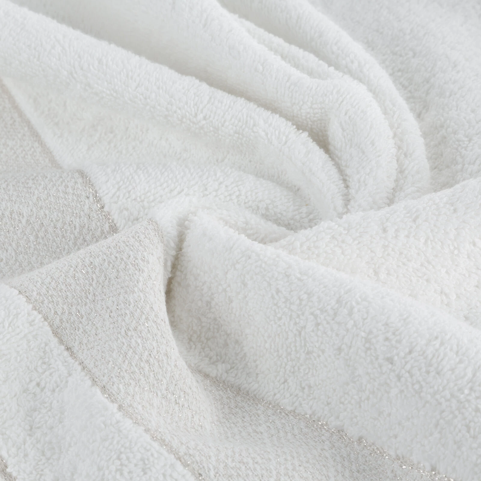 Jednobarwny ręcznik z miękkiej i chłonnej tkaniny bawełnianej o splocie frotte zdobiony kolorową bordiurą w stylu fastrygi. Łatwy w praniu, nie farbuje. szerokość: 70 cm, długość: 140 cm, kolor: biały, Gramatura: 500 GSM, Skład: 100% bawełna; część ozdobna: 50% bawełna, 50% poliester