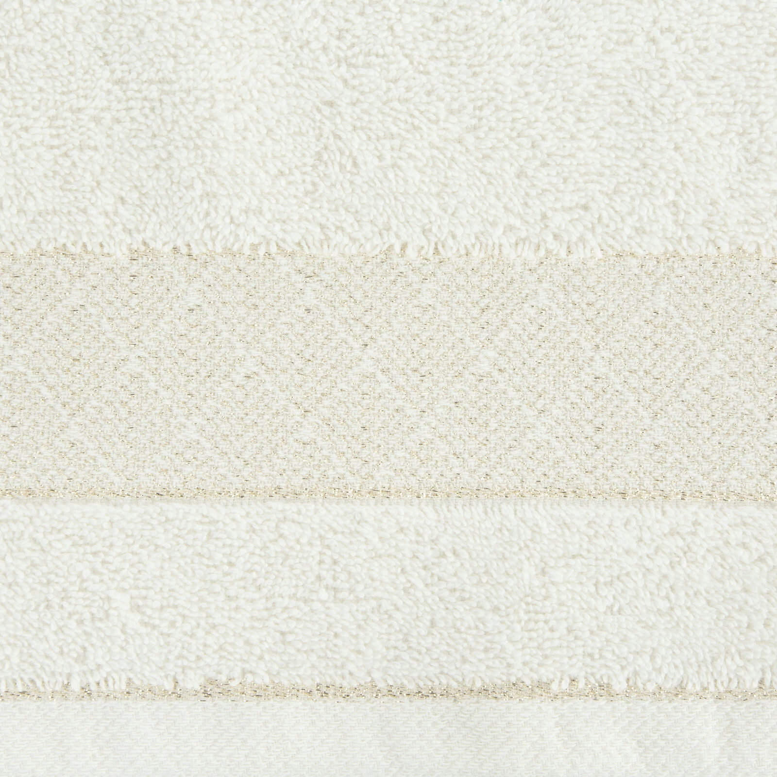 Jednobarwny ręcznik z miękkiej i chłonnej tkaniny bawełnianej o splocie frotte zdobiony kolorową bordiurą w stylu fastrygi. Łatwy w praniu, nie farbuje. szerokość: 50 cm, długość: 90 cm, kolor: kremowy, Gramatura: 500 GSM, Skład: 100% bawełna; część ozdobna: 50% bawełna, 50% poliester
