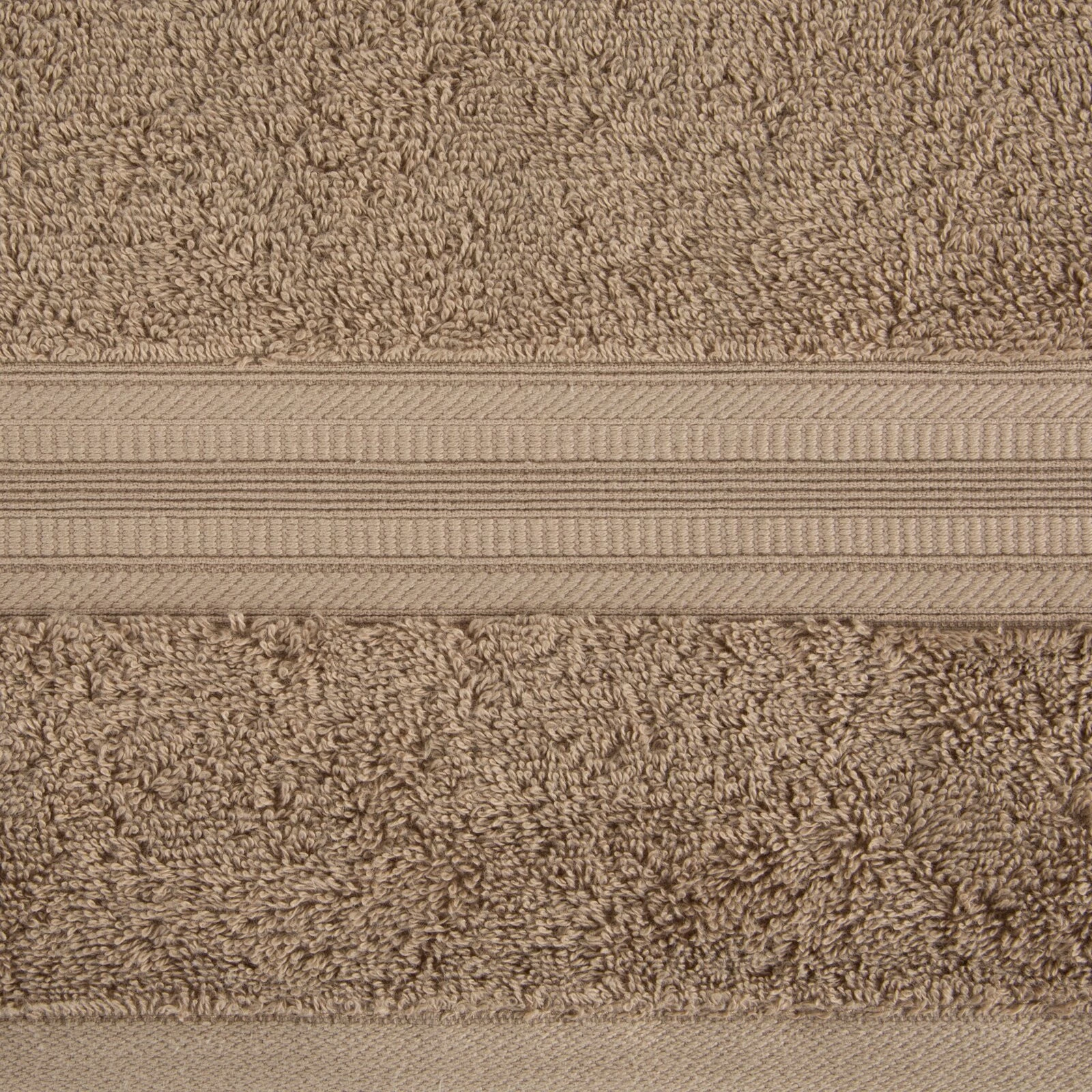 Jednobarwny ręcznik z miękkiej i chłonnej tkaniny bawełnianej o splocie frotte zdobiony kolorową bordiurą w stylu fastrygi. Łatwy w praniu, nie farbuje. szerokość: 30 cm, długość: 50 cm, kolor: beżowy, Gramatura: 550 GSM, Skład: 100% bawełna