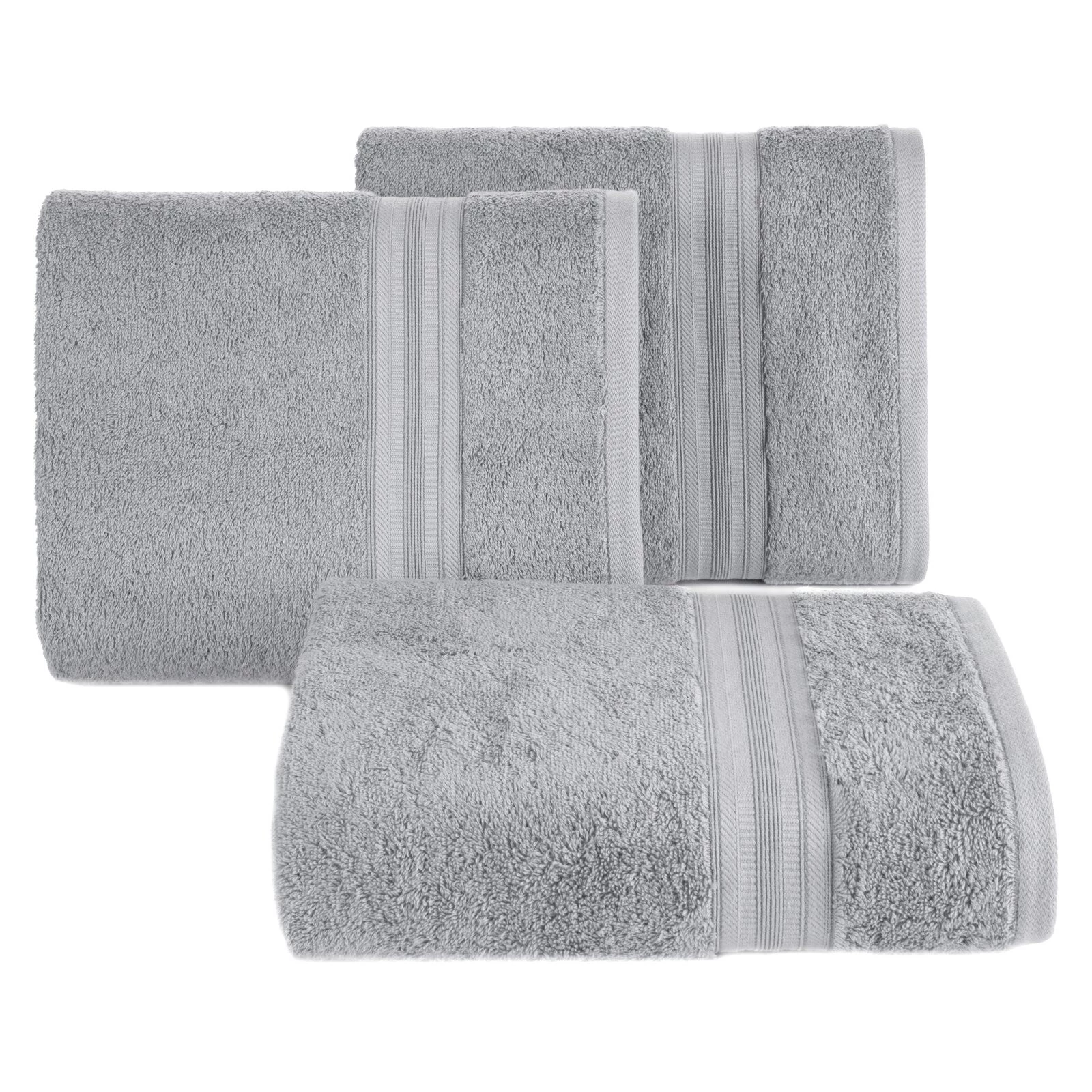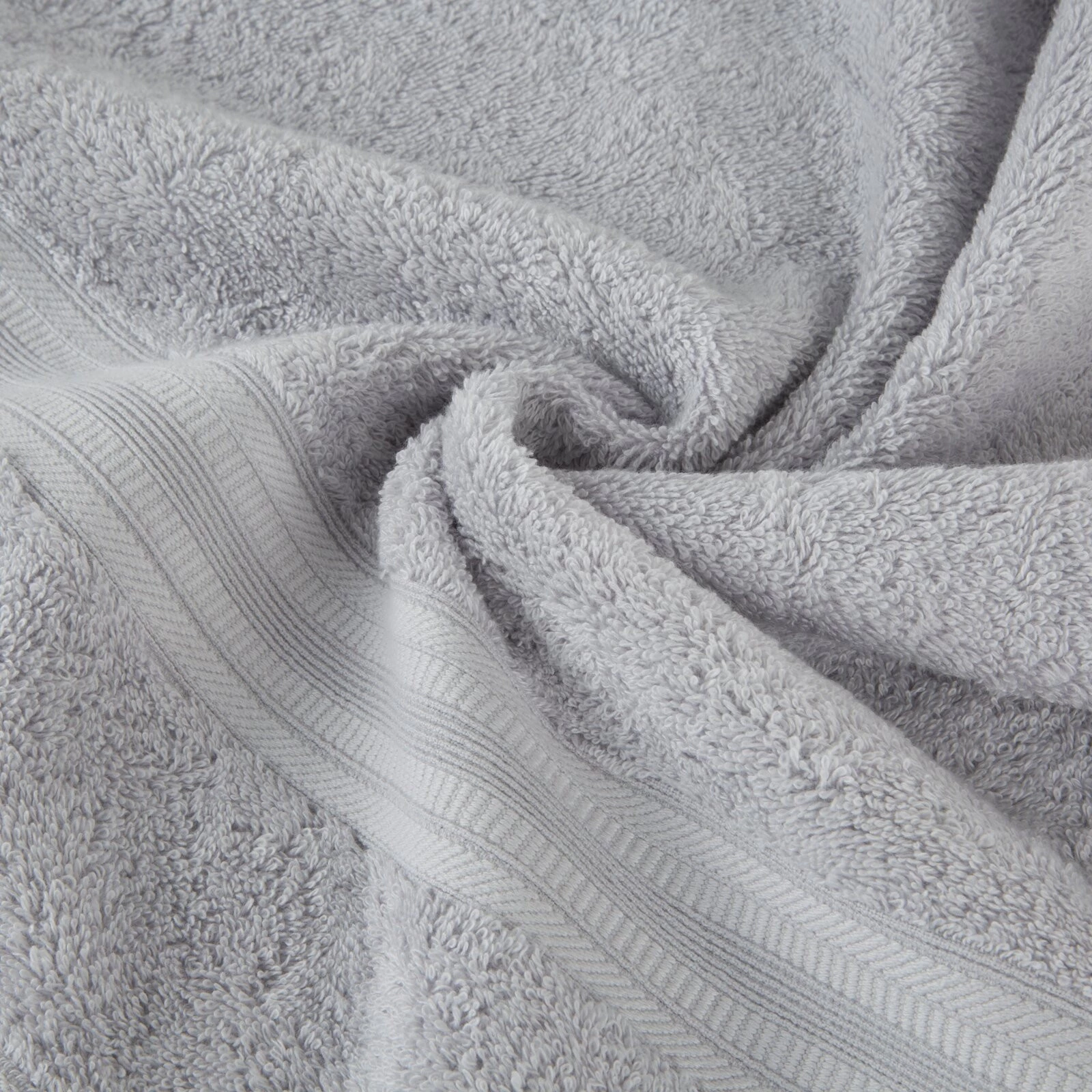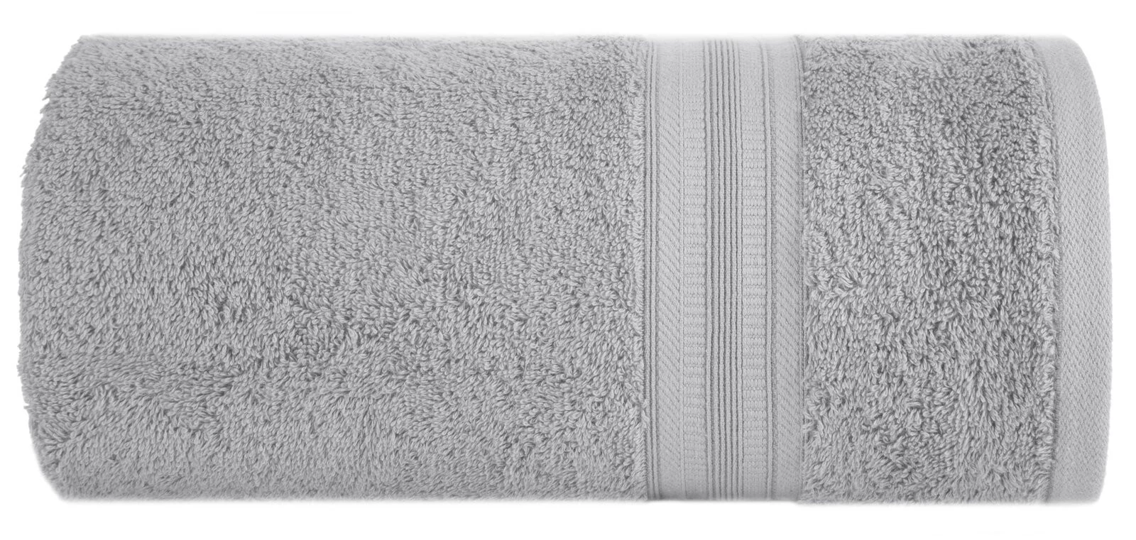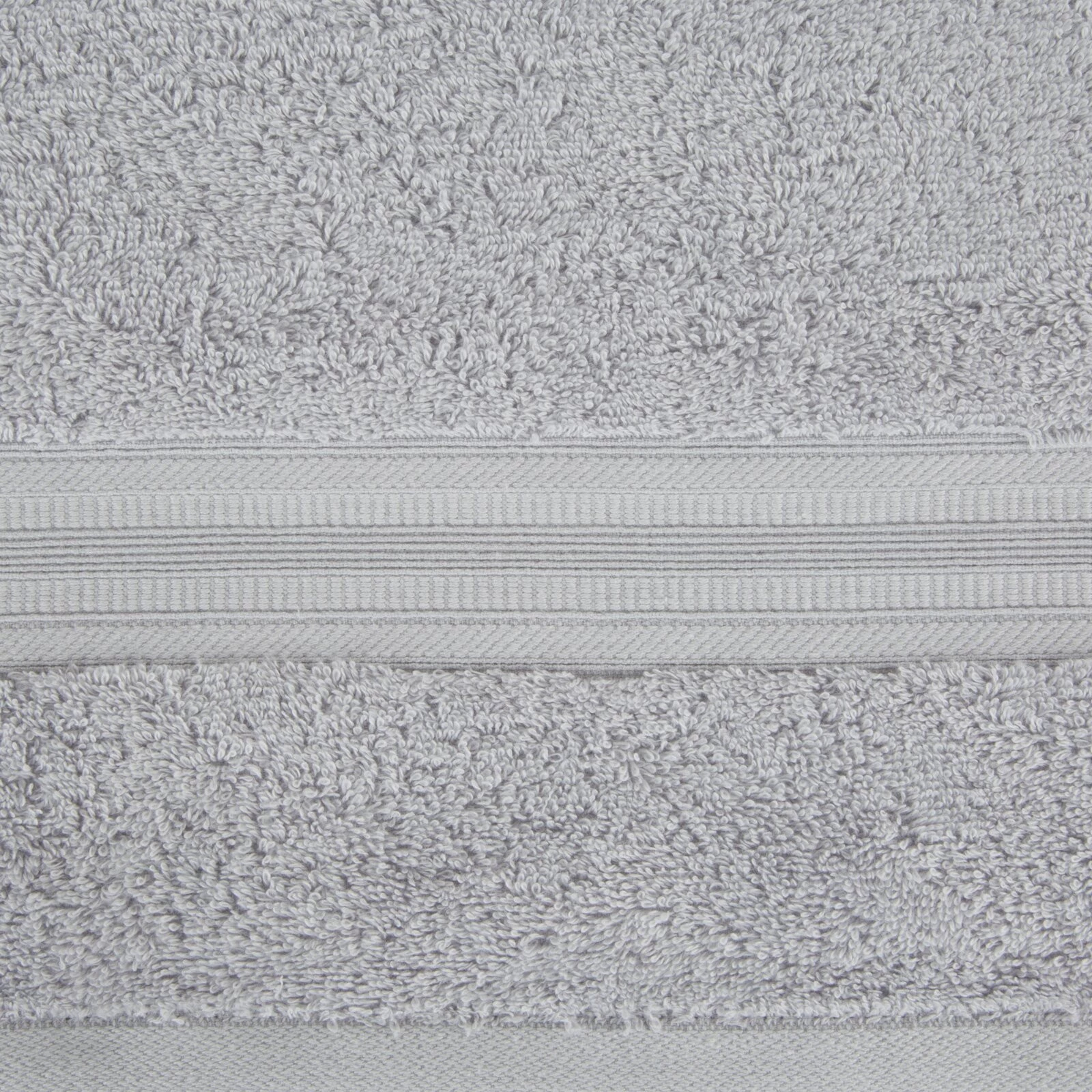 Jednobarwny ręcznik z miękkiej i chłonnej tkaniny bawełnianej o splocie frotte zdobiony kolorową bordiurą w stylu fastrygi. Łatwy w praniu, nie farbuje. szerokość: 30 cm, długość: 50 cm, kolor: jasnoszary, Gramatura: 550 GSM, Skład: 100% bawełna
