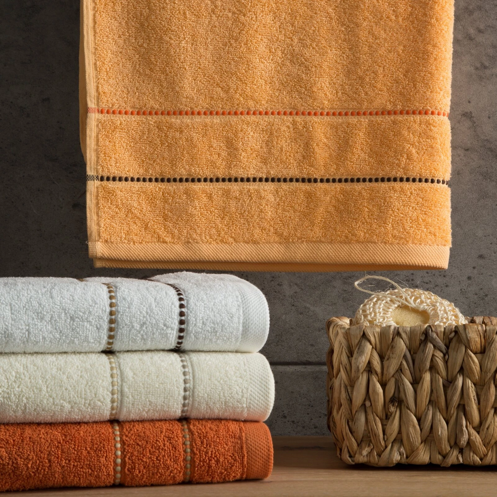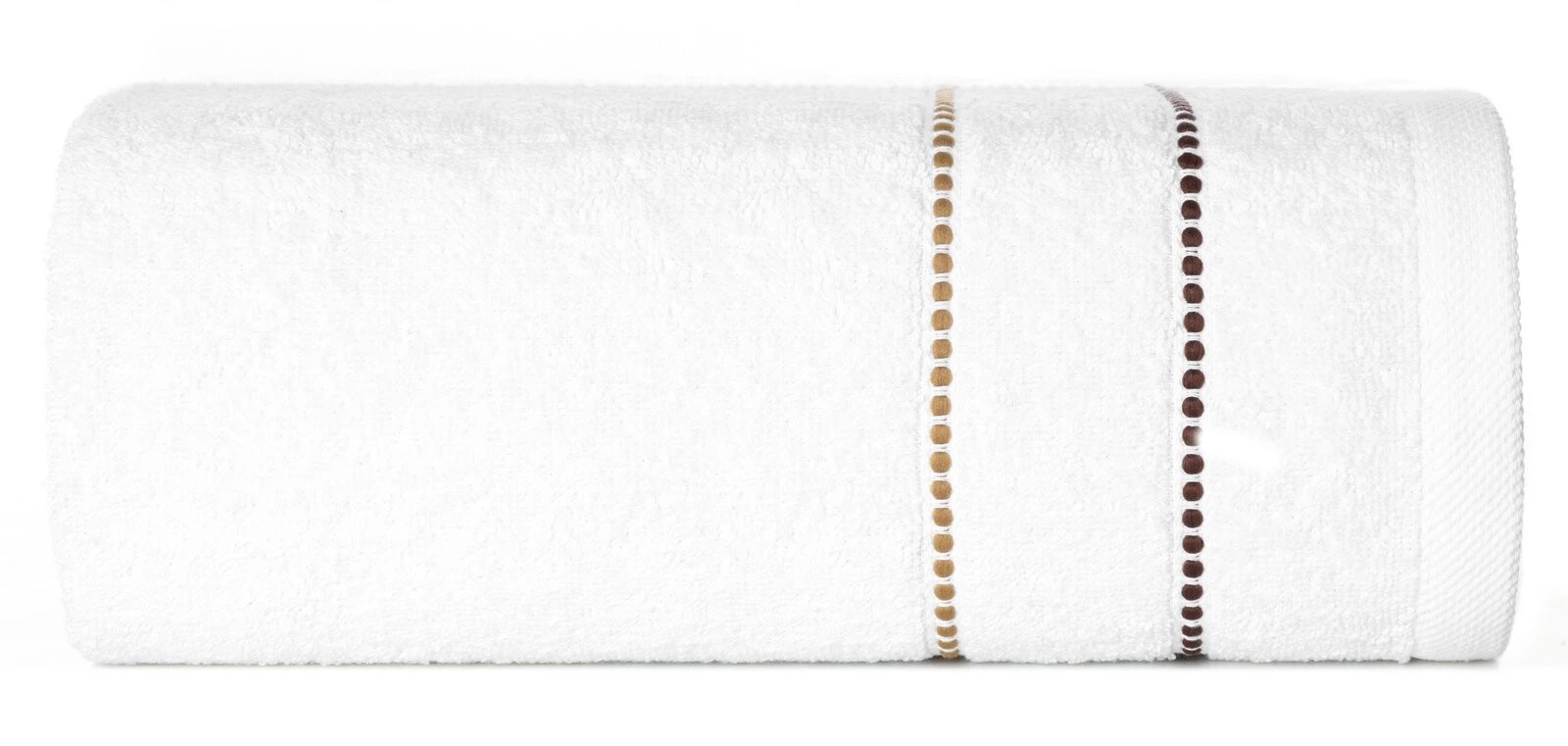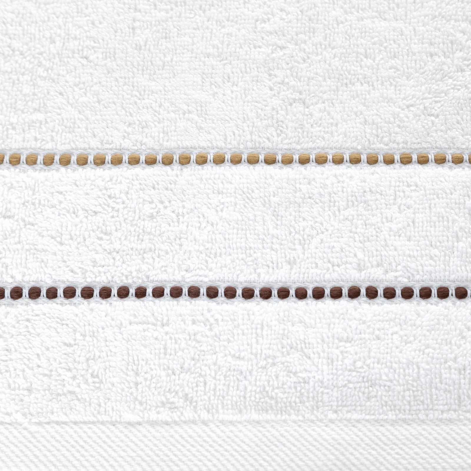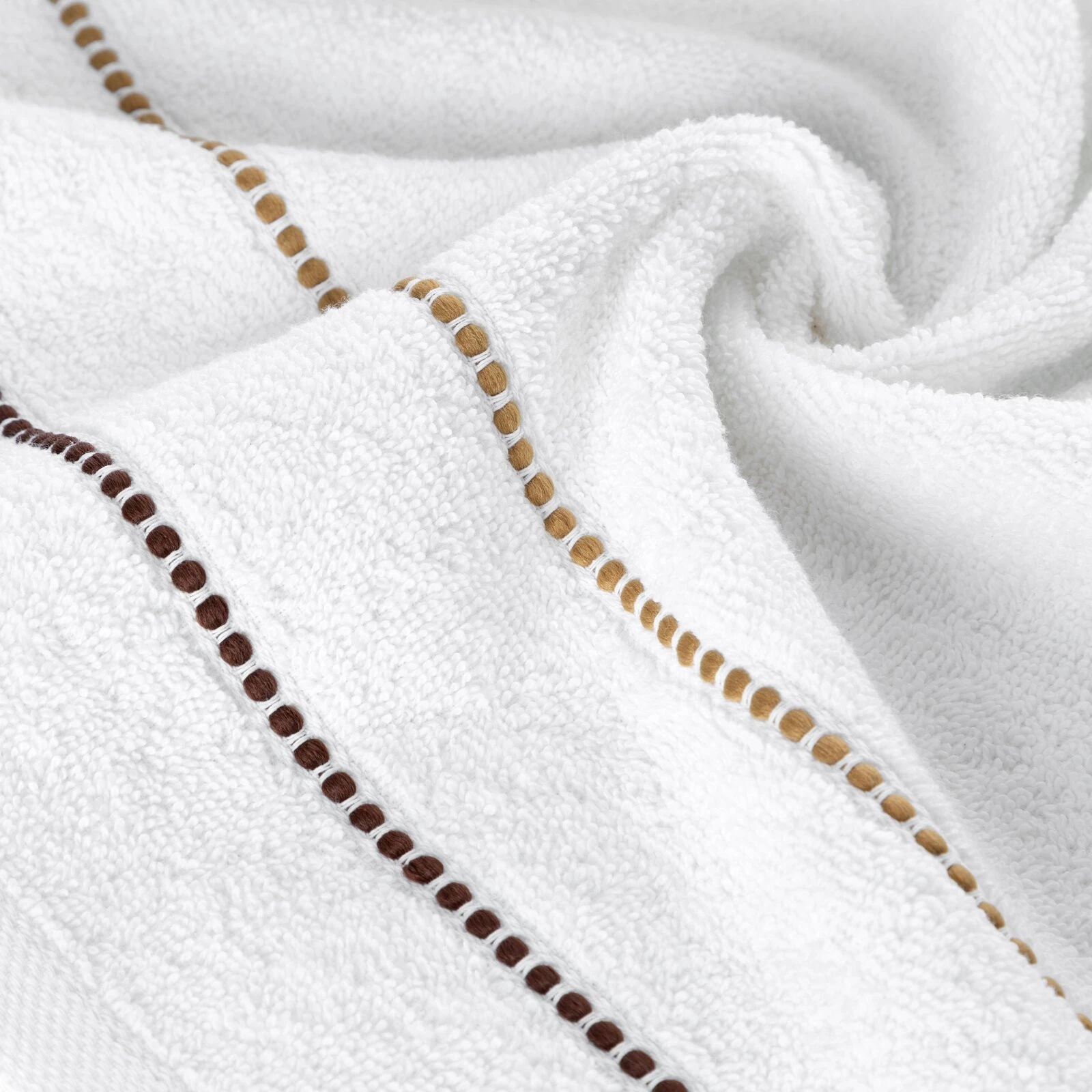 Jednobarwny ręcznik z miękkiej i chłonnej tkaniny bawełnianej o splocie frotte zdobiony kolorową bordiurą w stylu fastrygi. Łatwy w praniu, nie farbuje. szerokość: 30 cm, długość: 50 cm, kolor: biały, Gramatura: 500 GSM, Skład: 100% bawełna; część ozdobna: 50% bawełna, 50% poliester