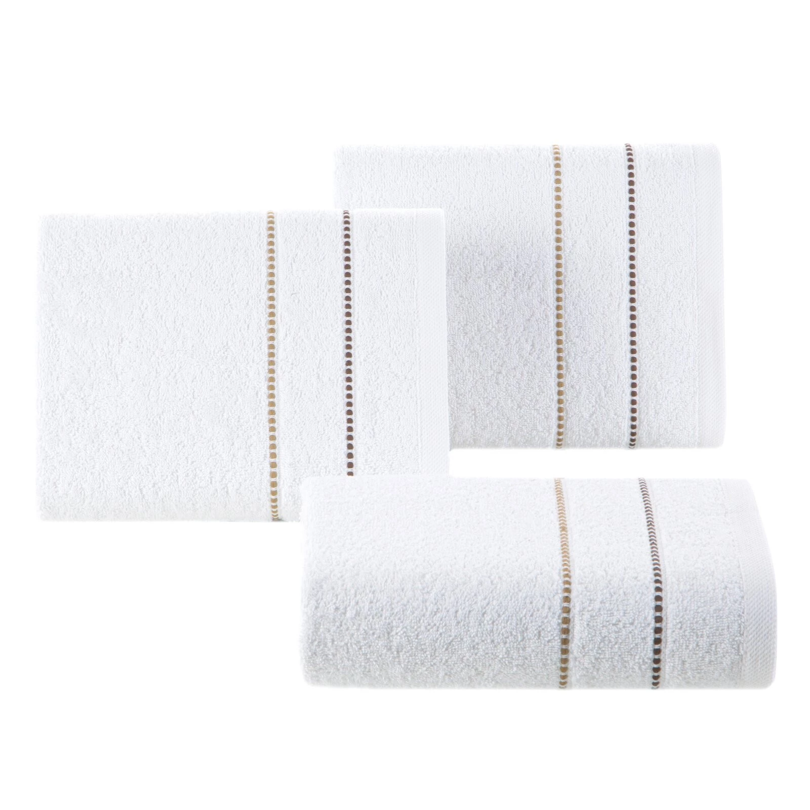 Jednobarwny ręcznik z miękkiej i chłonnej tkaniny bawełnianej o splocie frotte zdobiony kolorową bordiurą w stylu fastrygi. Łatwy w praniu, nie farbuje. szerokość: 50 cm, długość: 90 cm, kolor: biały, Gramatura: 500 GSM, Skład: 100% bawełna; część ozdobna: 50% bawełna, 50% poliester