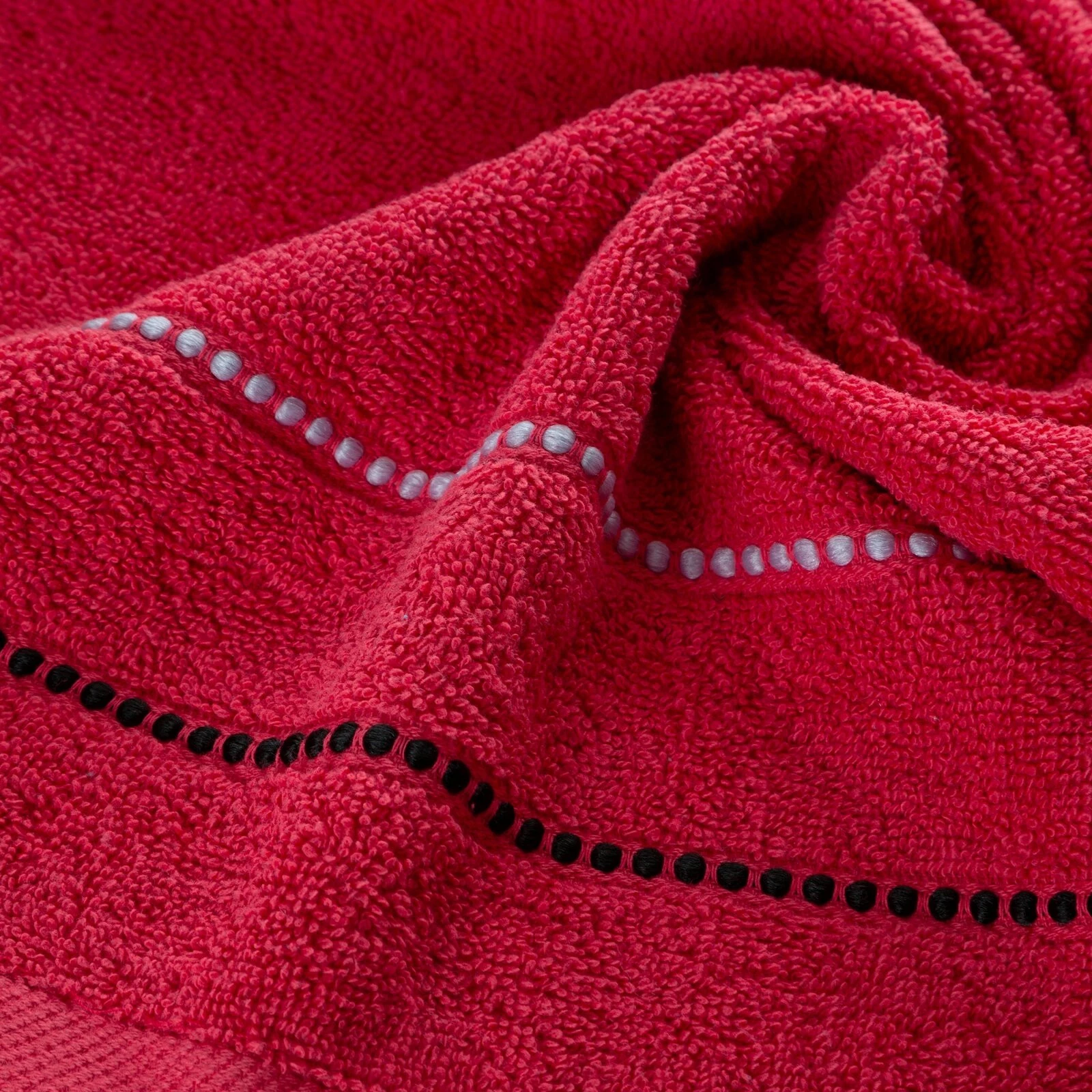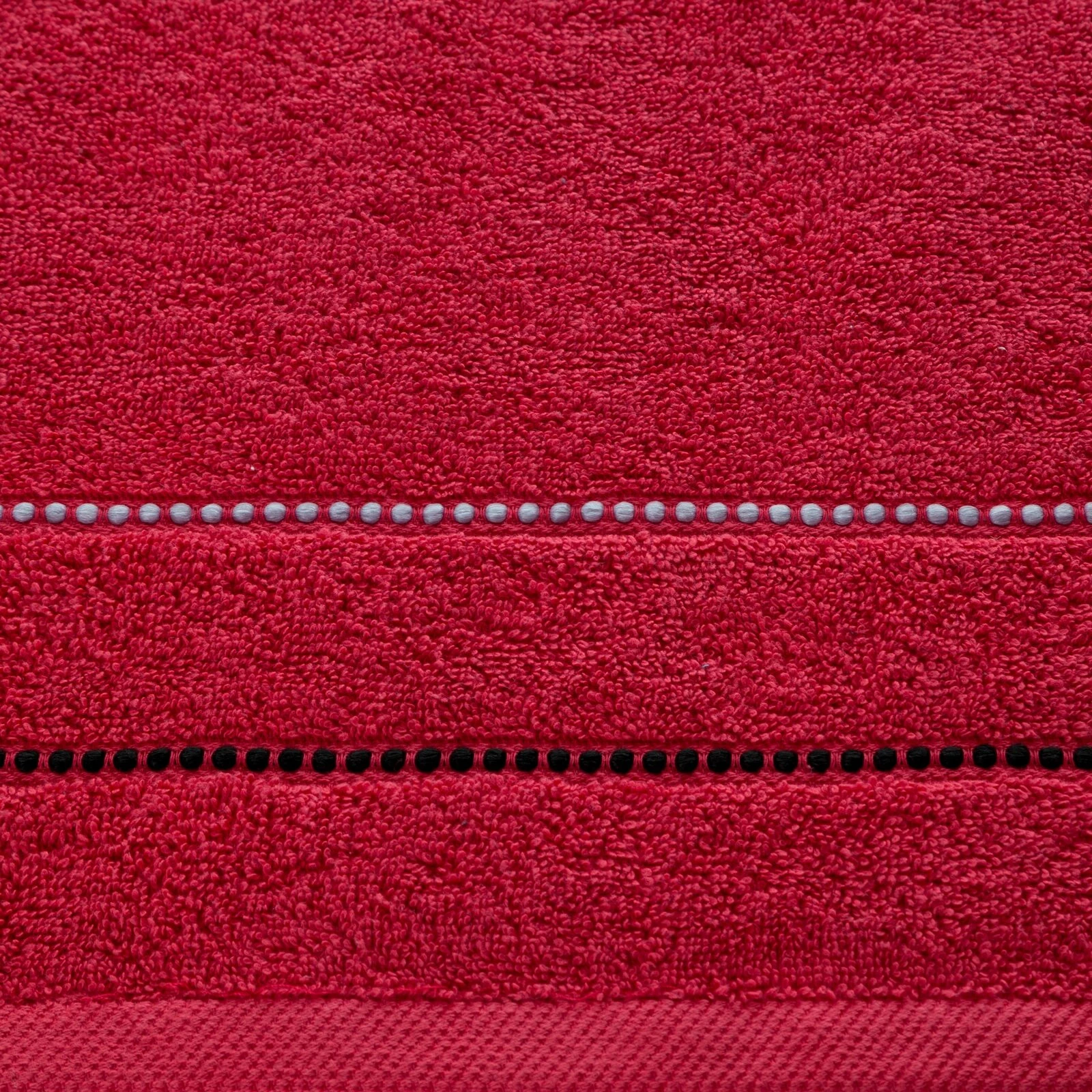 Jednobarwny ręcznik z miękkiej i chłonnej tkaniny bawełnianej o splocie frotte zdobiony kolorową bordiurą w stylu fastrygi. Łatwy w praniu, nie farbuje. szerokość: 50 cm, długość: 90 cm, kolor: czerwony, Gramatura: 500 GSM, Skład: 100% bawełna; część ozdobna: 50% bawełna, 50% poliester