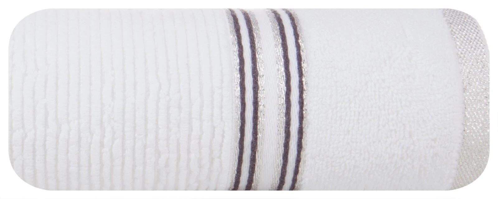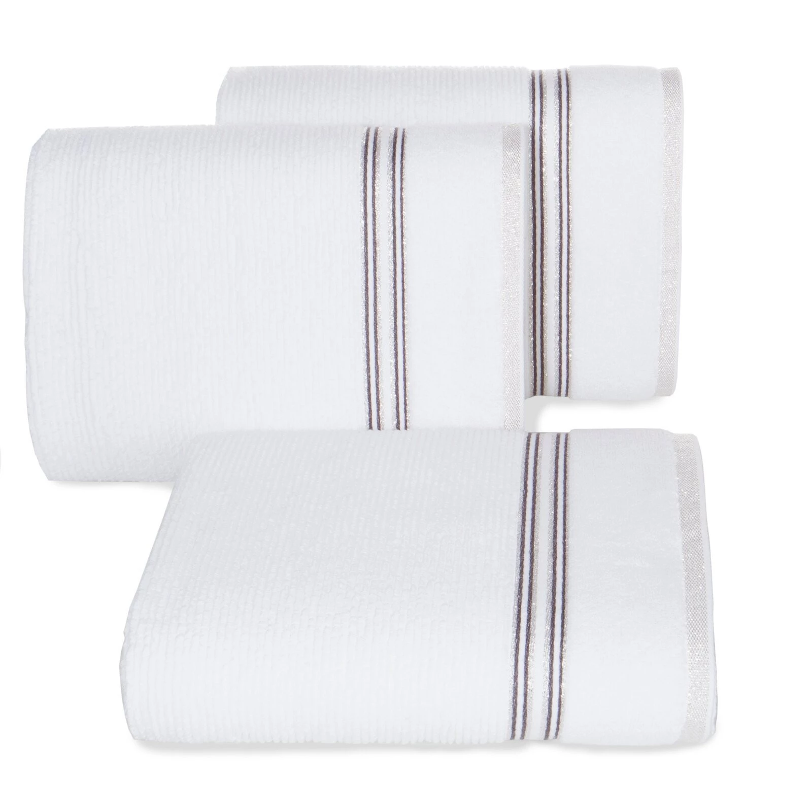 Bardzo puszysty i wyjątkowo chłonny ręcznik z bawełny frotte o strukturze delikatnych prążków. Bordiura w ciemniejszym kolorze z dodatkiem lśniącej nitki. szerokość: 70 cm, długość: 140 cm, kolor: biały, Gramatura: 530 GSM, Skład: 100% bawełna; część ozdobna: 97% bawełna, 3% poliester