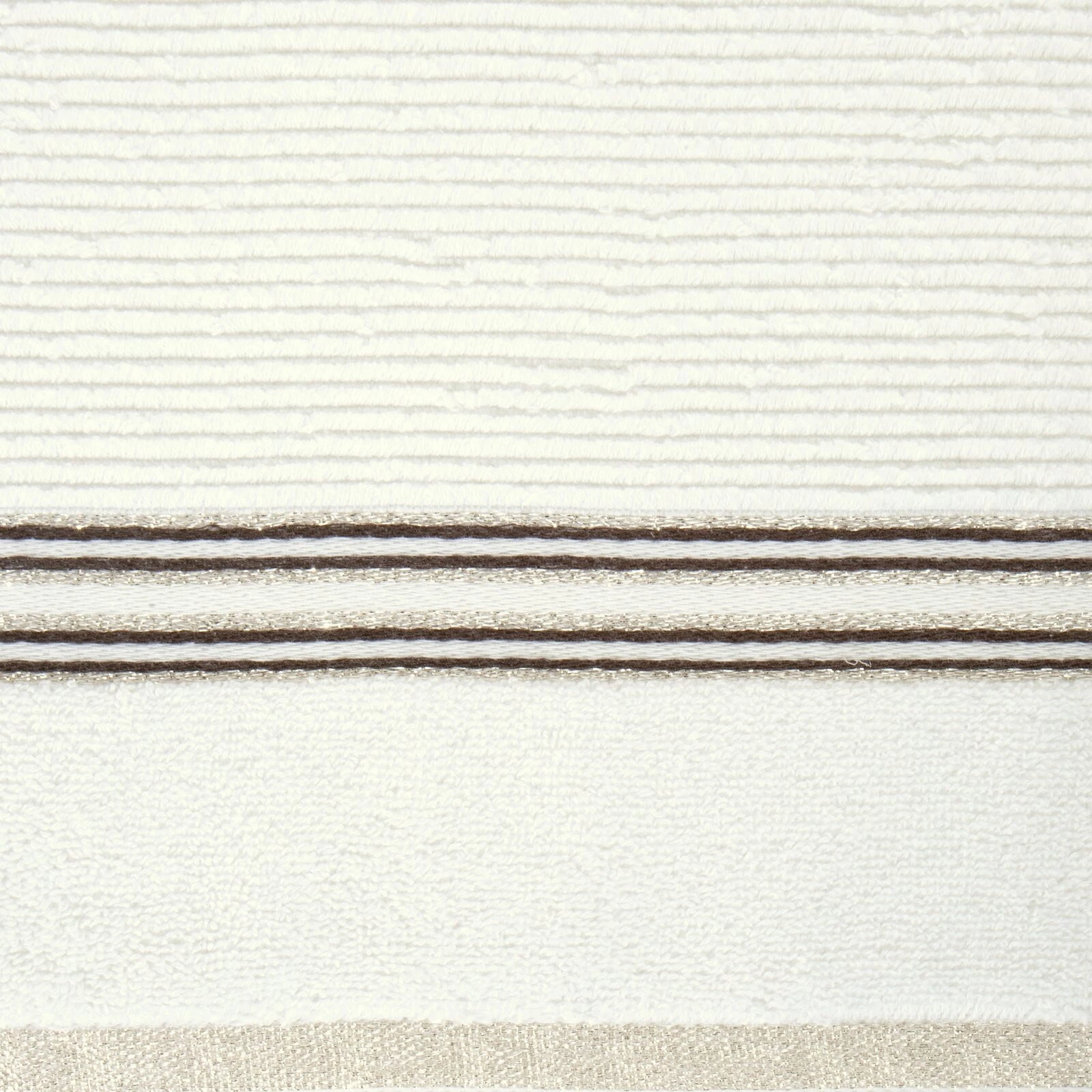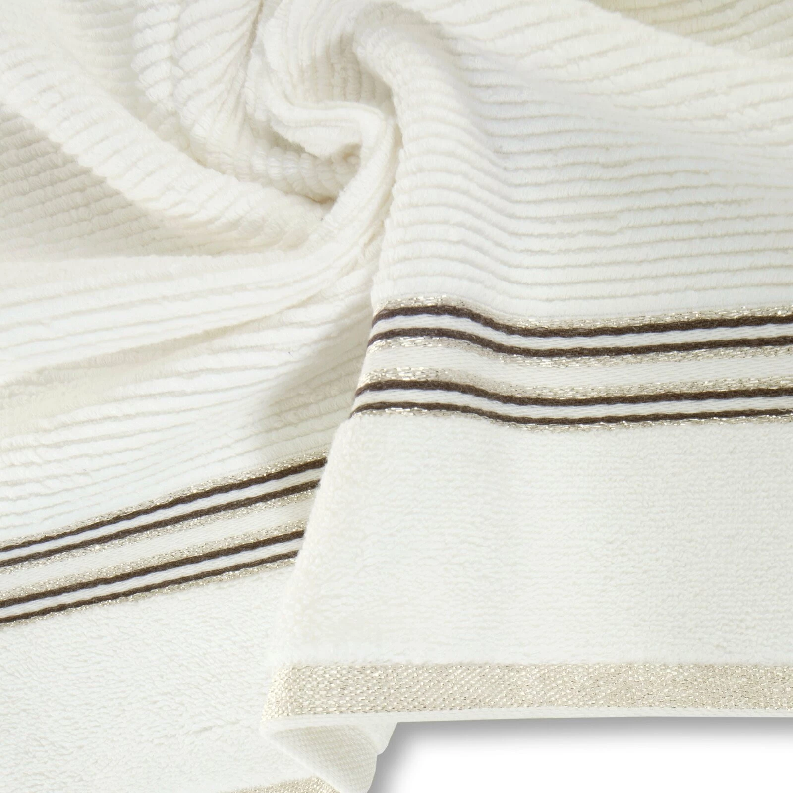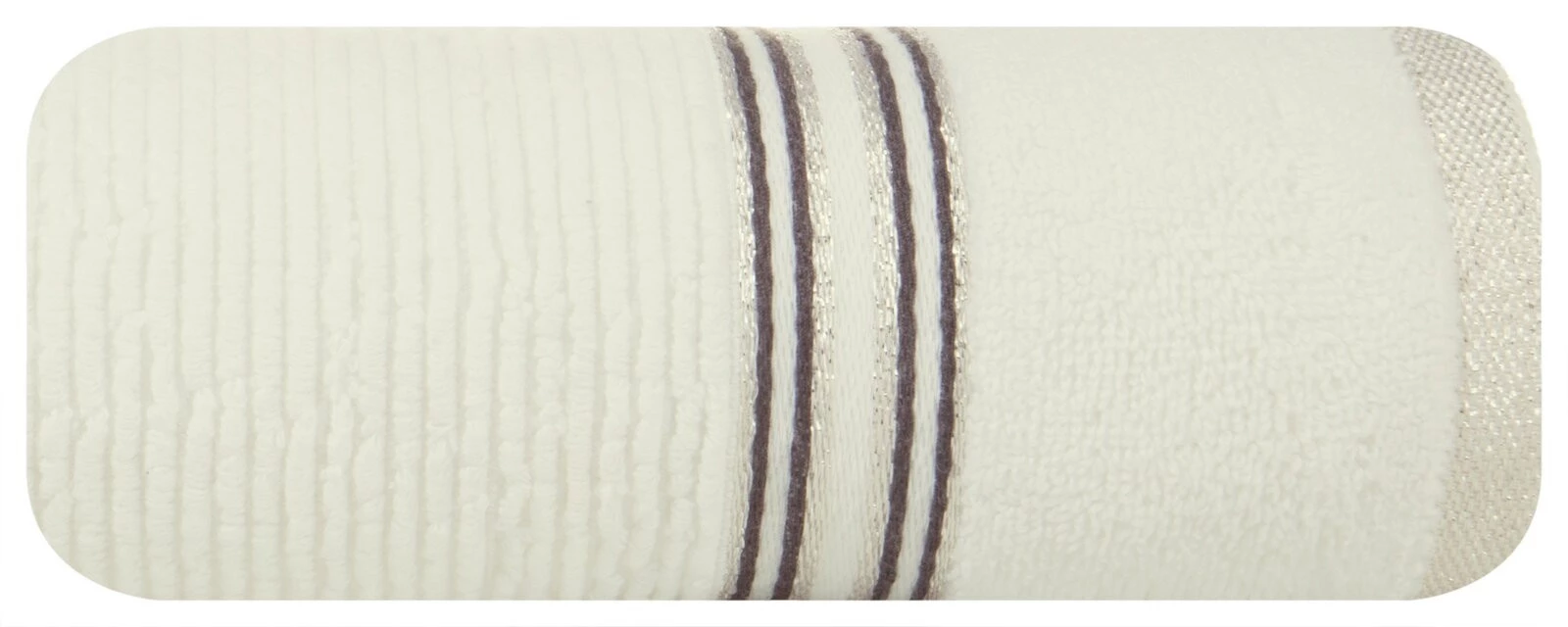 Bardzo puszysty i wyjątkowo chłonny ręcznik z bawełny frotte o strukturze delikatnych prążków. Bordiura w ciemniejszym kolorze z dodatkiem lśniącej nitki. szerokość: 70 cm, długość: 140 cm, kolor: kremowy, Gramatura: 530 GSM, Skład: 100% bawełna; część ozdobna: 97% bawełna, 3% poliester