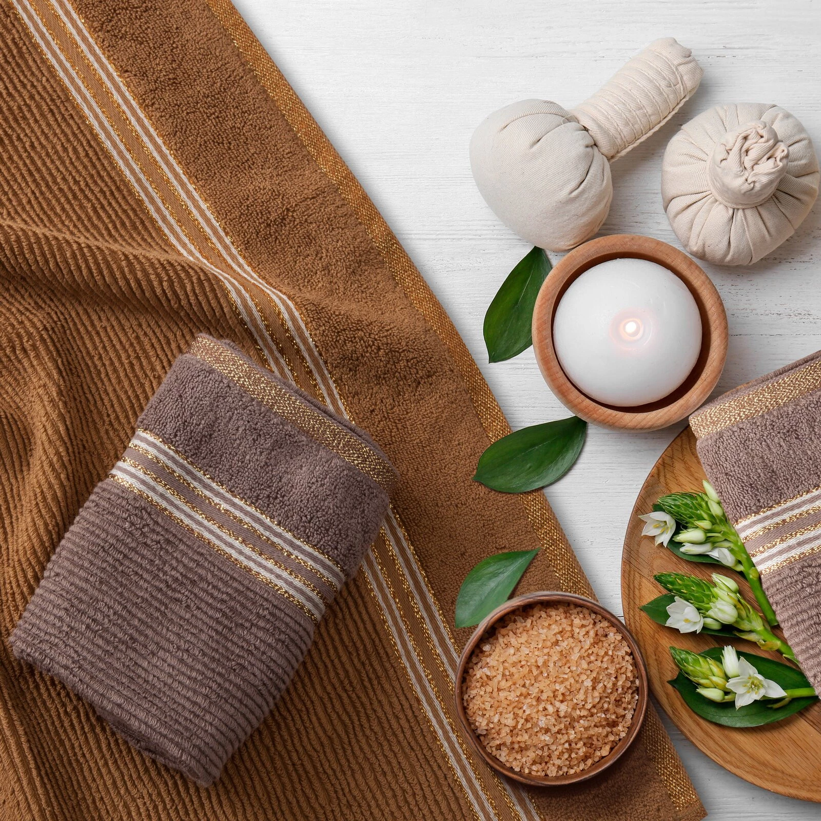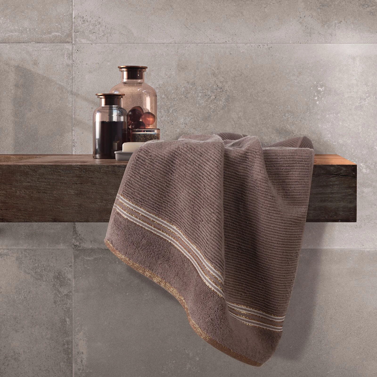 Bardzo puszysty i wyjątkowo chłonny ręcznik z bawełny frotte o strukturze delikatnych prążków. Bordiura w ciemniejszym kolorze z dodatkiem lśniącej nitki. szerokość: 70 cm, długość: 140 cm, kolor: srebrny, Gramatura: 530 GSM, Skład: 100% bawełna; część ozdobna: 97% bawełna, 3% poliester