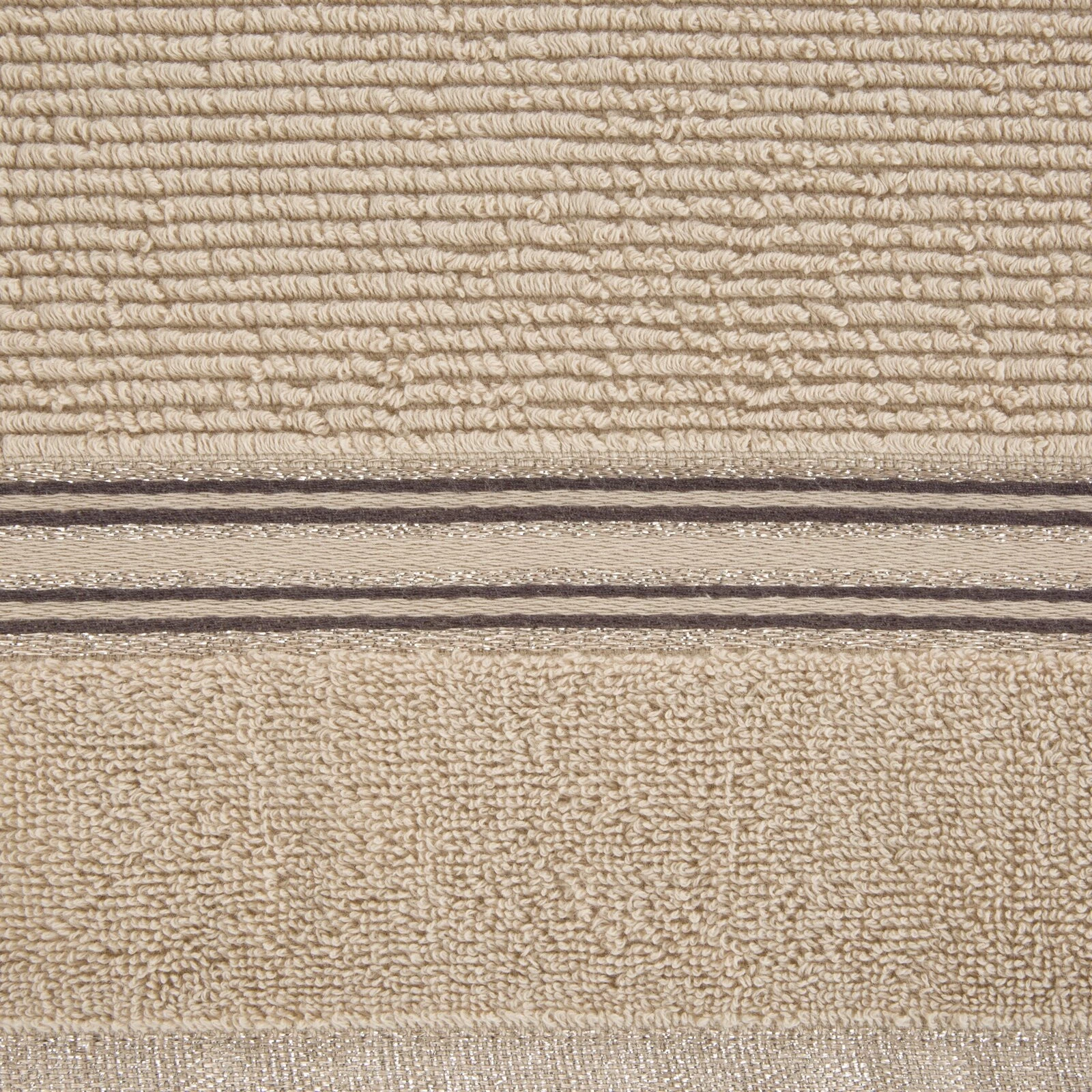 Bardzo puszysty i wyjątkowo chłonny ręcznik z bawełny frotte o strukturze delikatnych prążków. Bordiura w ciemniejszym kolorze z dodatkiem lśniącej nitki. szerokość: 50 cm, długość: 90 cm, kolor: beżowy, Gramatura: 530 GSM, Skład: 100% bawełna; część ozdobna: 97% bawełna, 3% poliester
