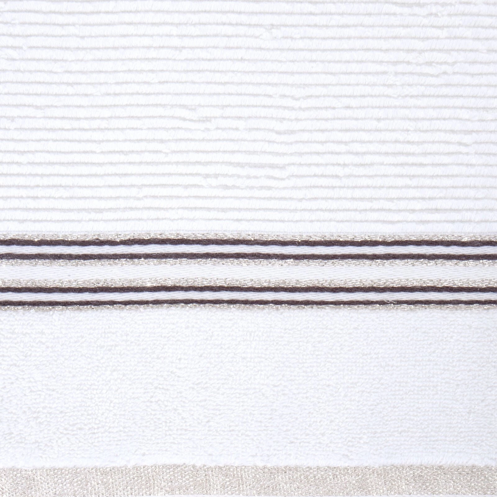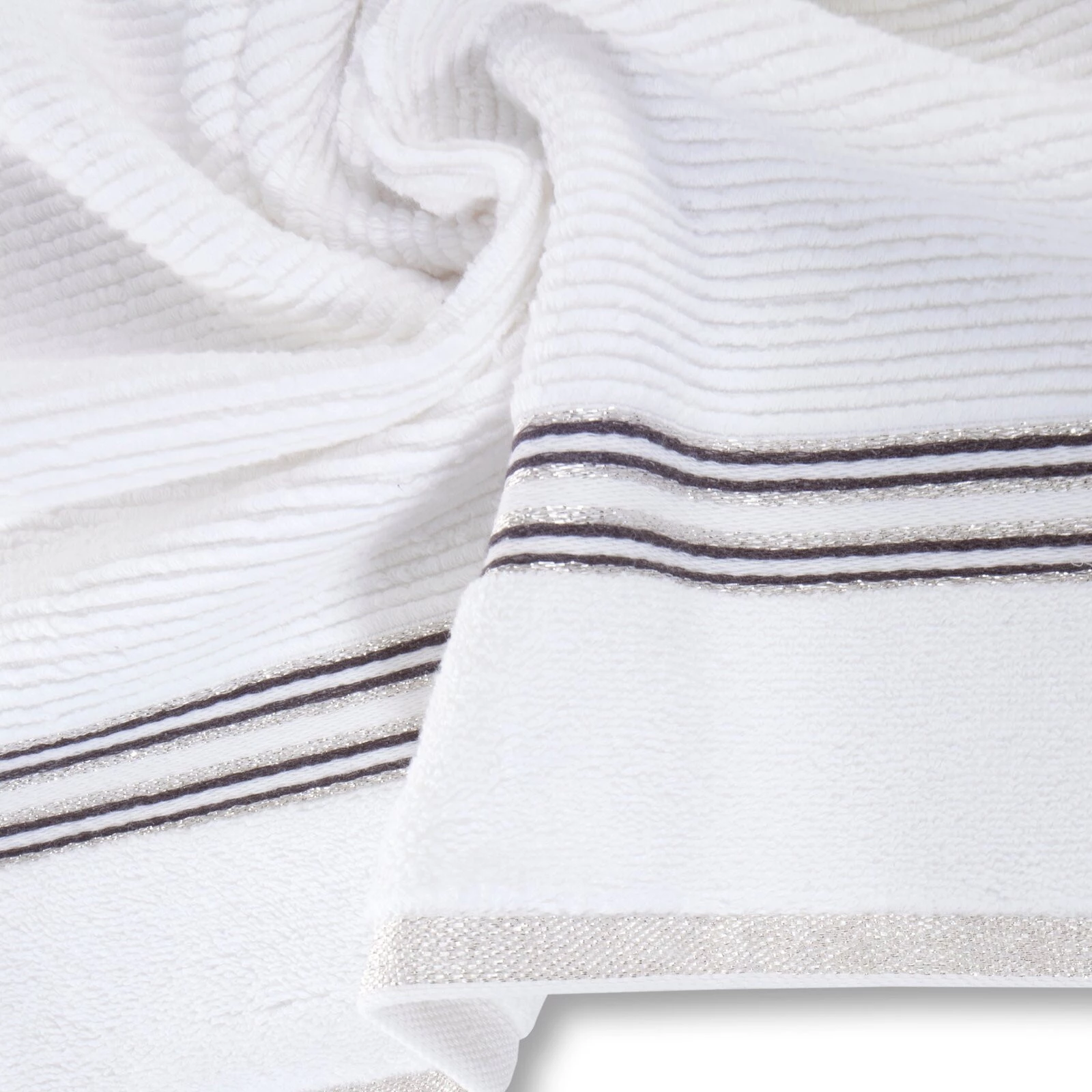 Bardzo puszysty i wyjątkowo chłonny ręcznik z bawełny frotte o strukturze delikatnych prążków. Bordiura w ciemniejszym kolorze z dodatkiem lśniącej nitki. szerokość: 30 cm, długość: 50 cm, kolor: biały, Gramatura: 530 GSM, Skład: 100% bawełna; część ozdobna: 97% bawełna, 3% poliester