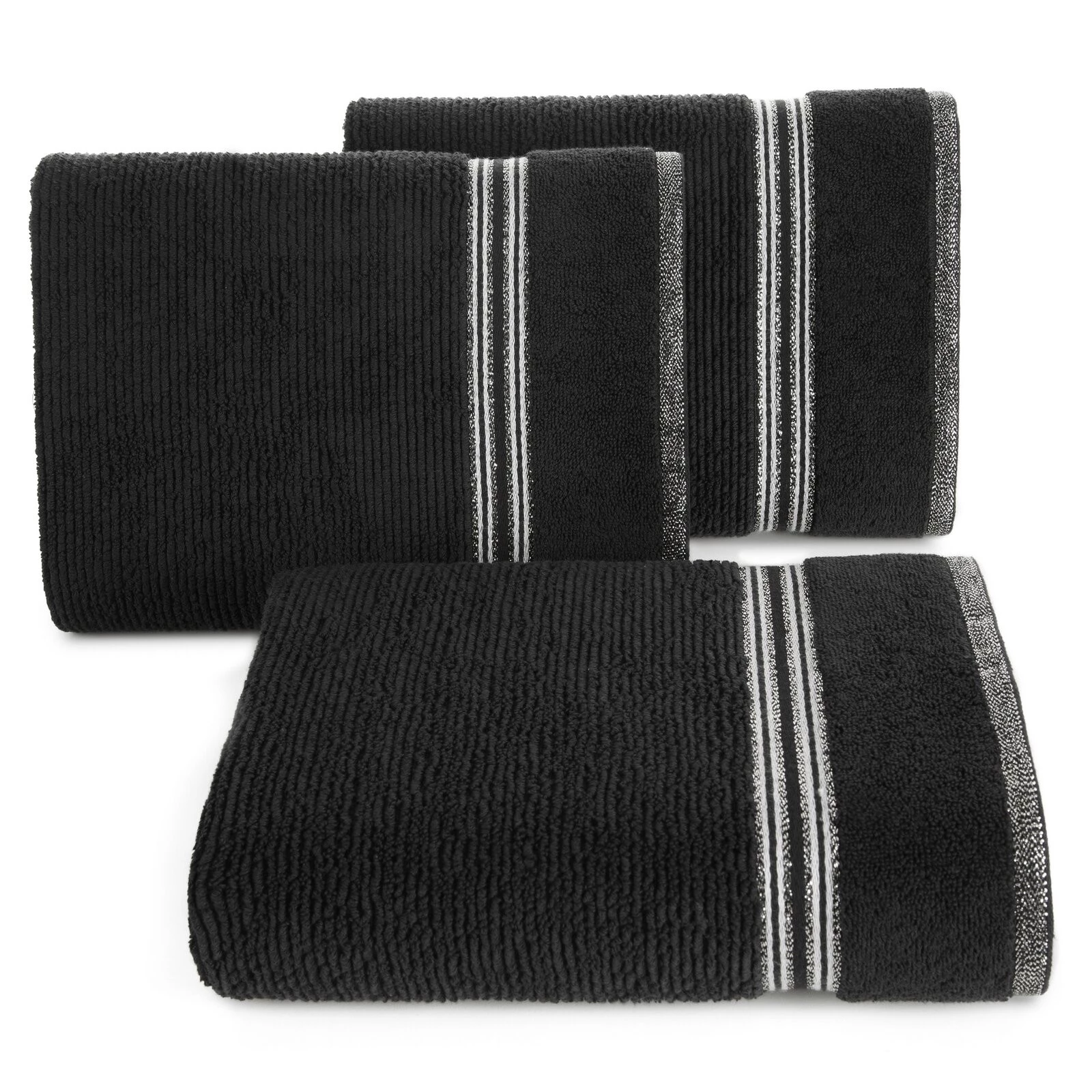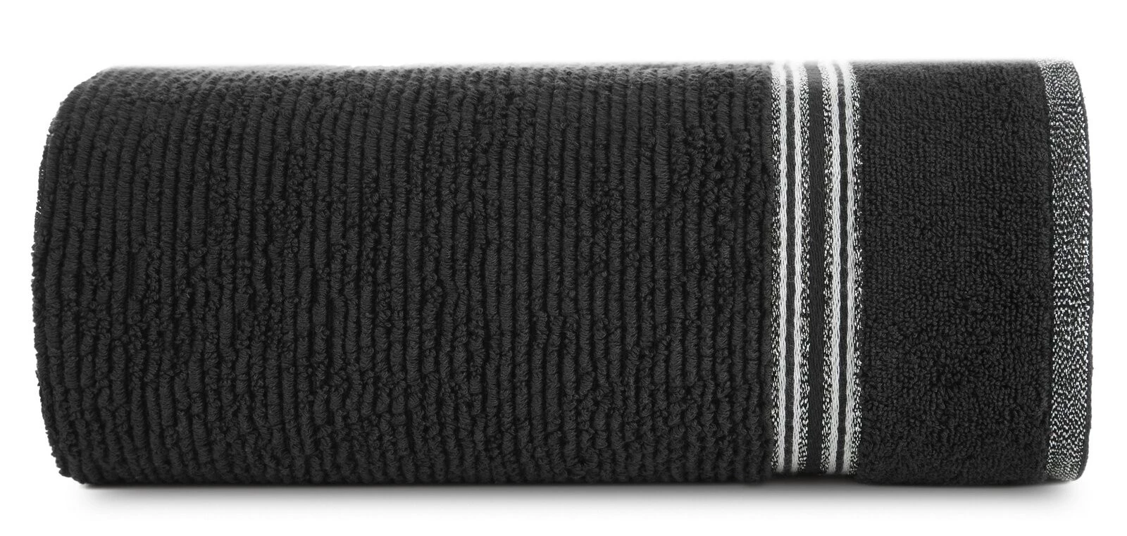 Bardzo puszysty i wyjątkowo chłonny ręcznik z bawełny frotte o strukturze delikatnych prążków. Bordiura w ciemniejszym kolorze z dodatkiem lśniącej nitki. szerokość: 30 cm, długość: 50 cm, kolor: czarny, Gramatura: 530 GSM, Skład: 100% bawełna; część ozdobna: 97% bawełna, 3% poliester