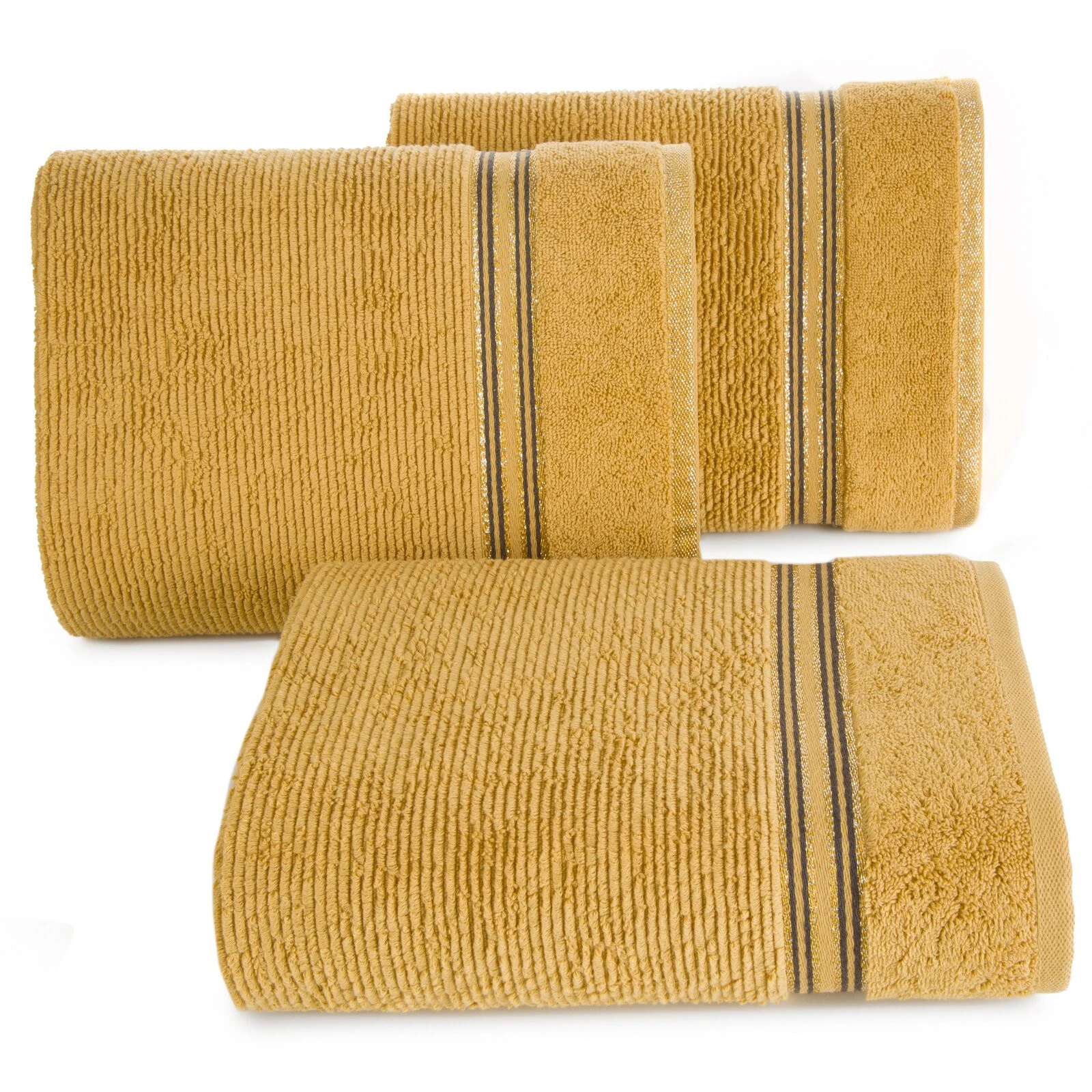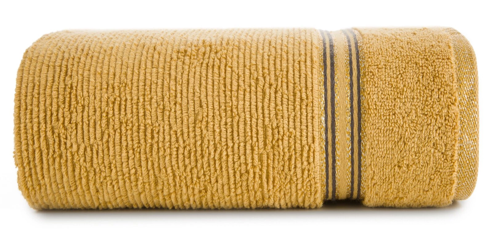 Bardzo puszysty i wyjątkowo chłonny ręcznik z bawełny frotte o strukturze delikatnych prążków. Bordiura w ciemniejszym kolorze z dodatkiem lśniącej nitki. szerokość: 50 cm, długość: 90 cm, kolor: musztardowy, Gramatura: 530 GSM, Skład: 100% bawełna; część ozdobna: 97% bawełna, 3% poliester