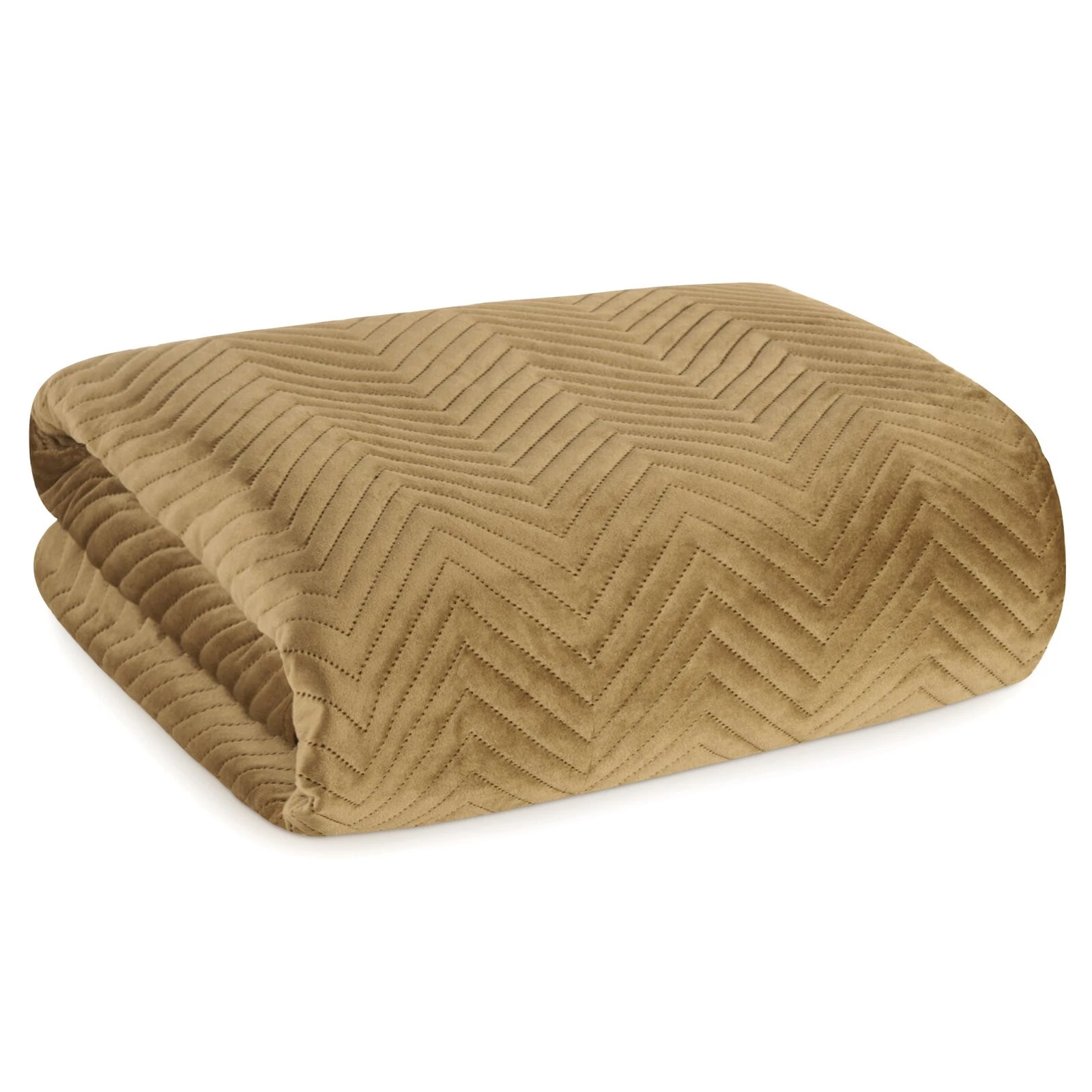 Ekskluzywna narzuta na łóżko z miękkiego i przyjemnego w dotyku welwetu pikowanego w dużą, gęstą jodełką. Do pikowania wykorzystano metodę bezszwową hotpress. szerokość: 170 cm, długość: 210 cm, kolor: miodowy, Gramatura: 250+120+65 GSM, Skład: 100% poliester