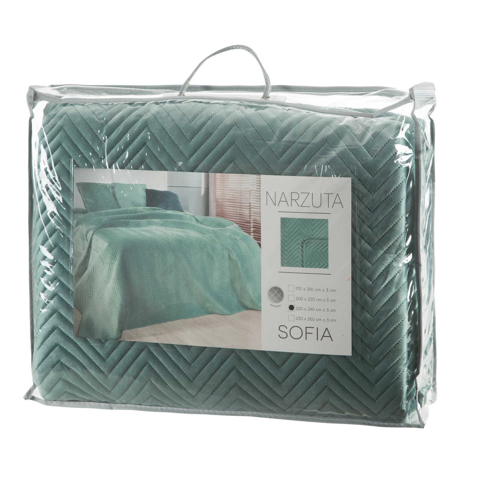 Ekskluzywna narzuta na łóżko z miękkiego i przyjemnego w dotyku welwetu pikowanego w dużą, gęstą jodełką. Do pikowania wykorzystano metodę bezszwową hotpress. szerokość: 220 cm, długość: 240 cm, kolor: miętowy, Gramatura: 250+120+65 GSM, Skład: 100% poliester