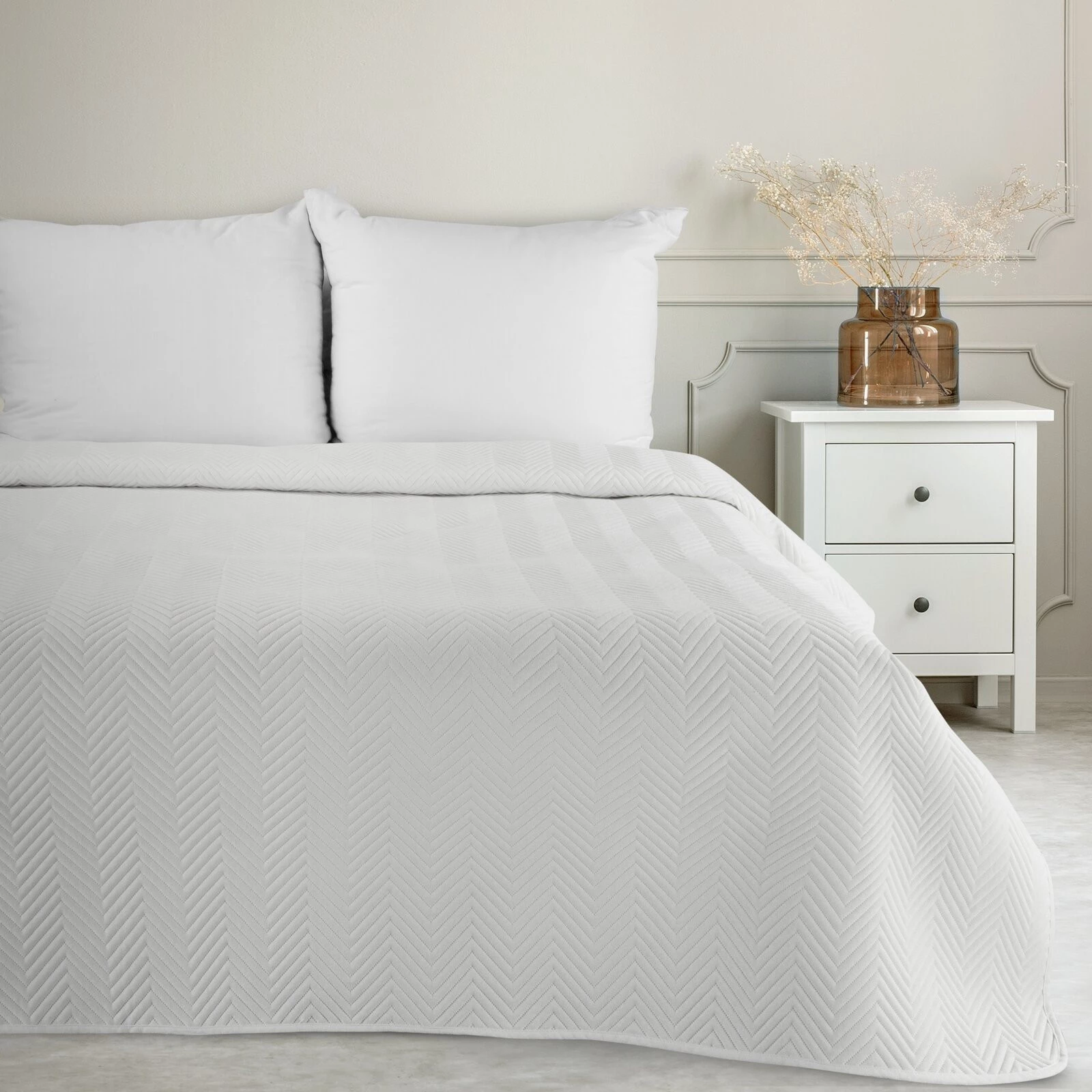 Narzuta hot press imitująca len szerokość: 170 cm, długość: 210 cm, kolor: biały, Gramatura: 185 GSM, Skład: 100% poliester