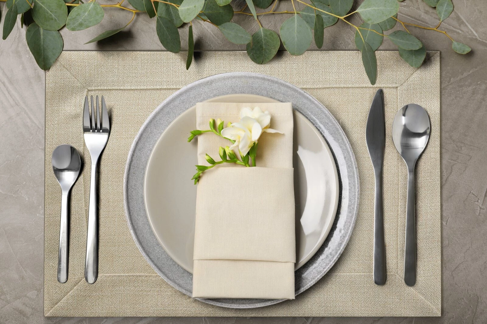 Serweta zdobiona kantą i błyszczącą nicią szerokość: 85 cm, długość: 85 cm, kolor: beżowy, Gramatura: 260 GSM, Skład: 100% poliester
