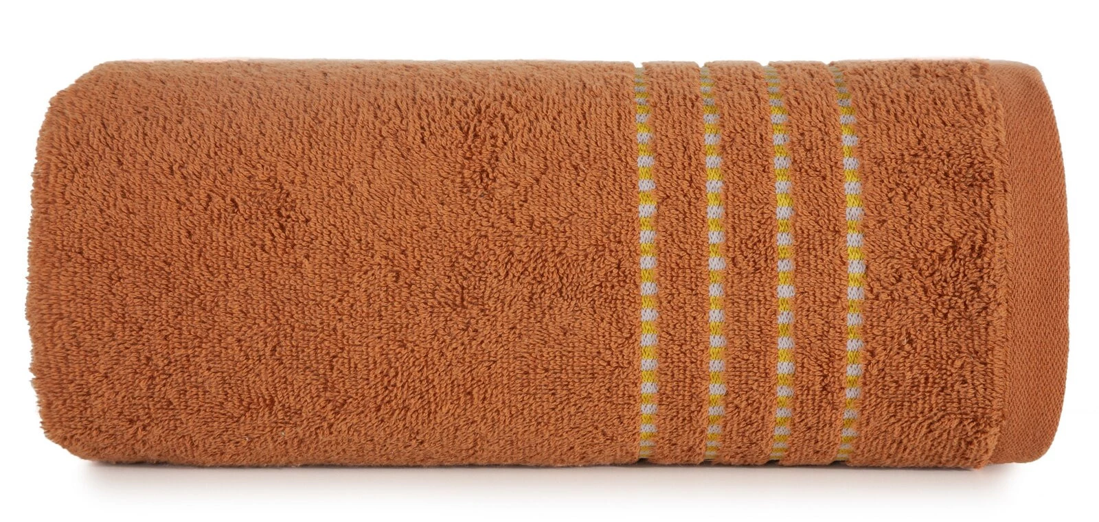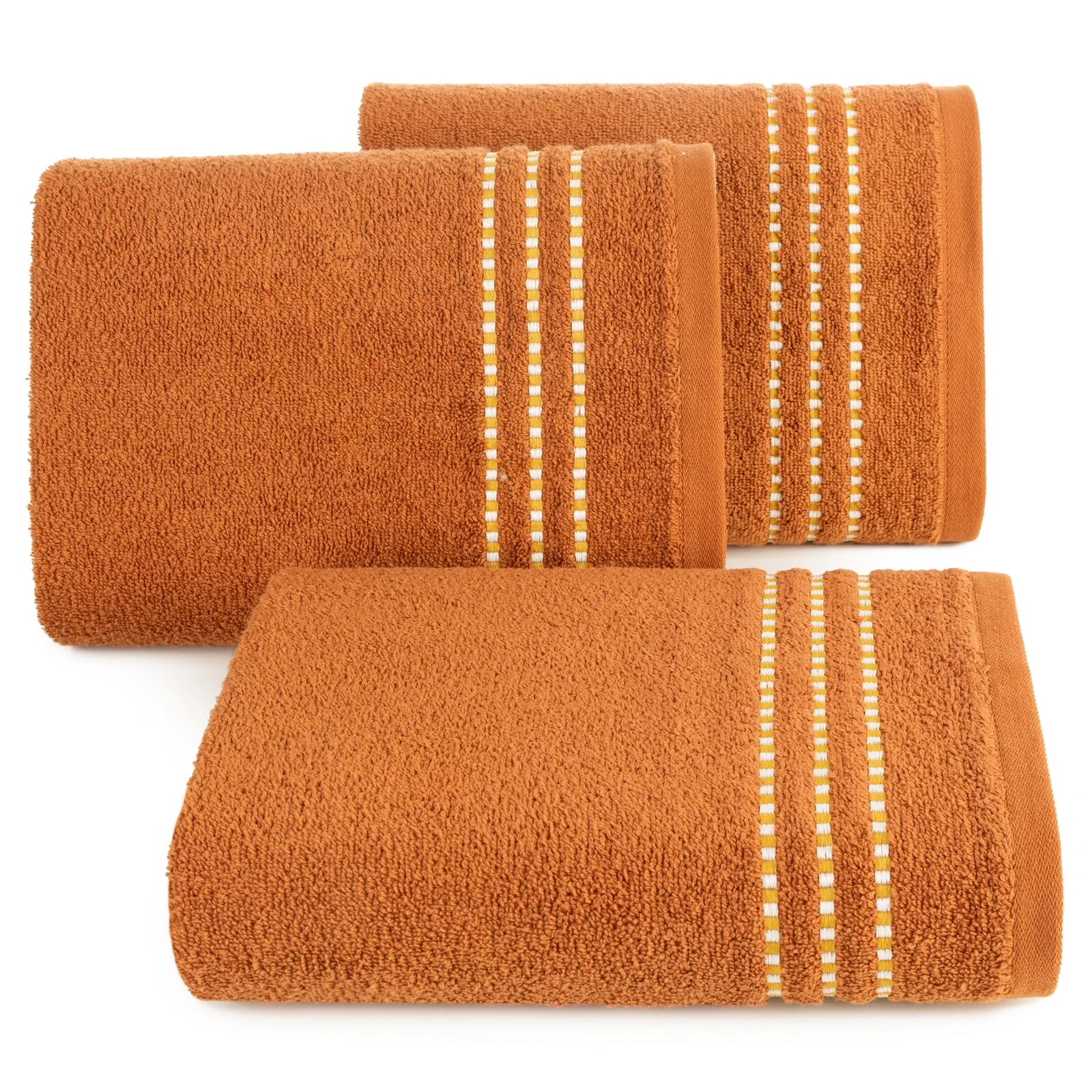 Klasyczny ręcznik kąpielowy z chłonnej tkaniny bawełnianej o splocie frotte. Minimalistyczna bordiura z weluru z dodatkiem lśniącej, metalicznej nici. szerokość: 70 cm, długość: 140 cm, kolor: ceglasty, Gramatura: 500 GSM, Skład: 100% bawełna; część ozdobna: 100% poliester