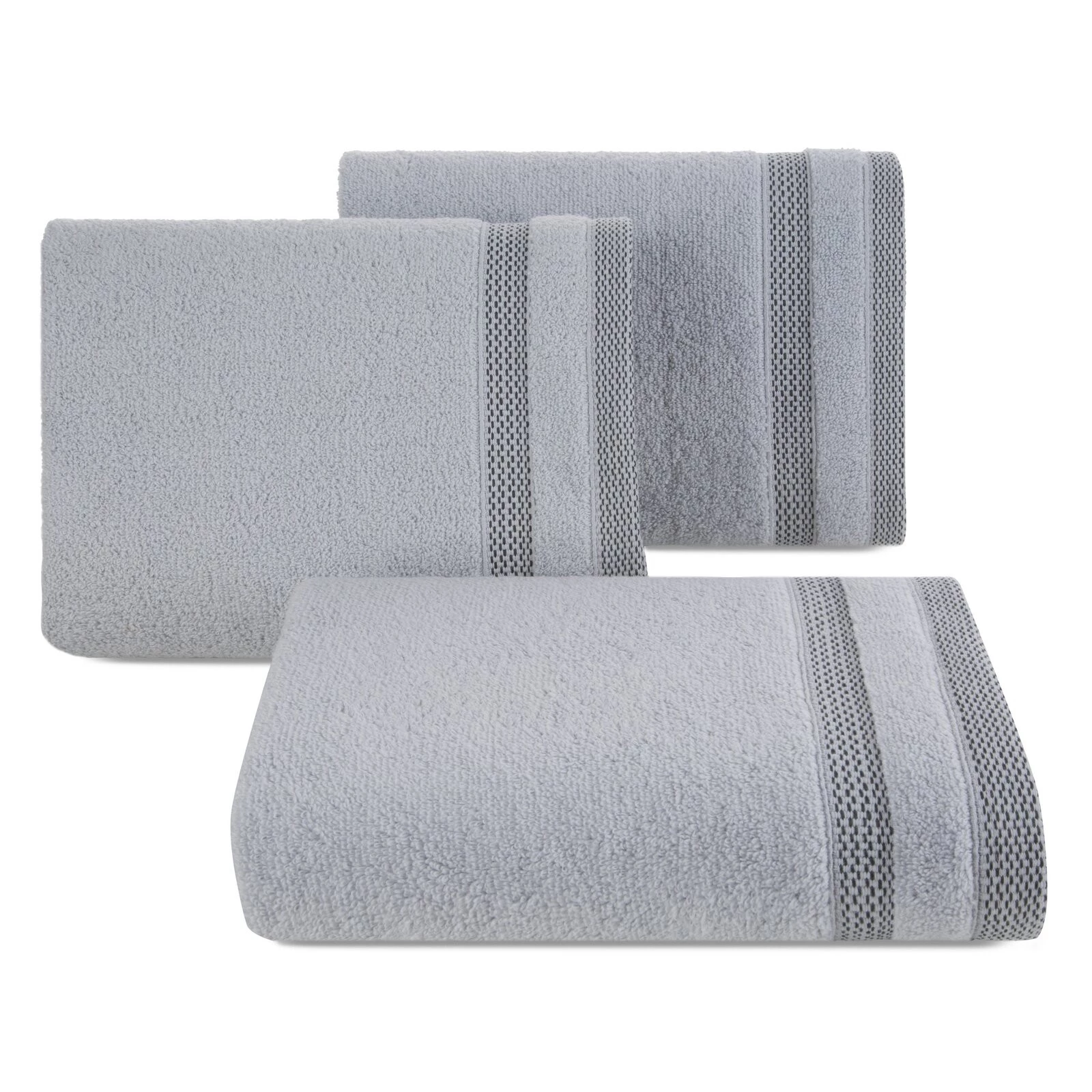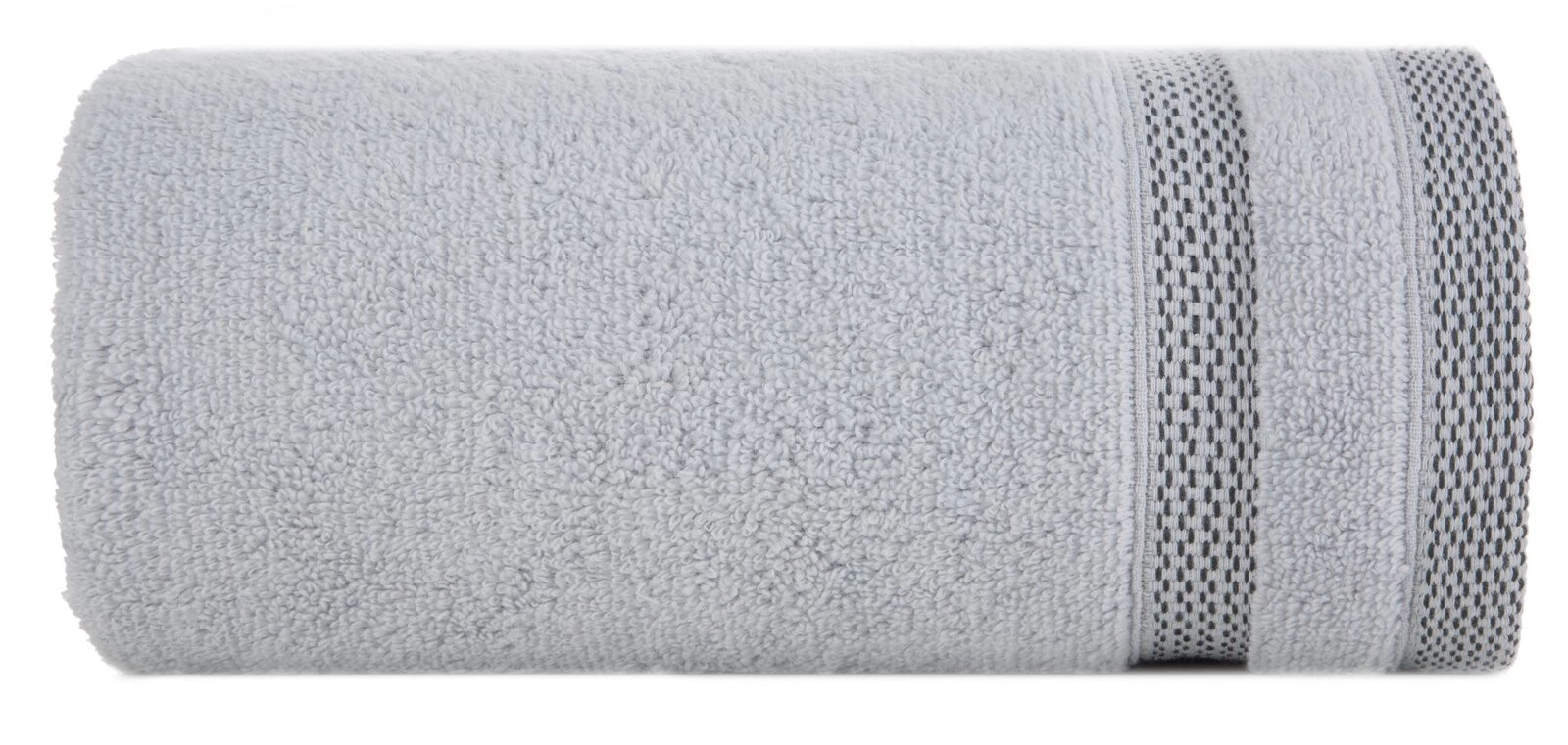 Puszysty i chłonny ręcznik kąpielowy z bawełny frotte o klasycznym charakterze zdobiony elegancką bordiurą w paski z dodatkiem lśniących nici. Łatwy w praniu. szerokość: 70 cm, długość: 140 cm, kolor: srebrny, Gramatura: 400 GSM, Skład: 100% bawełna; część ozdobna: 50% bawełna, 50% poliester