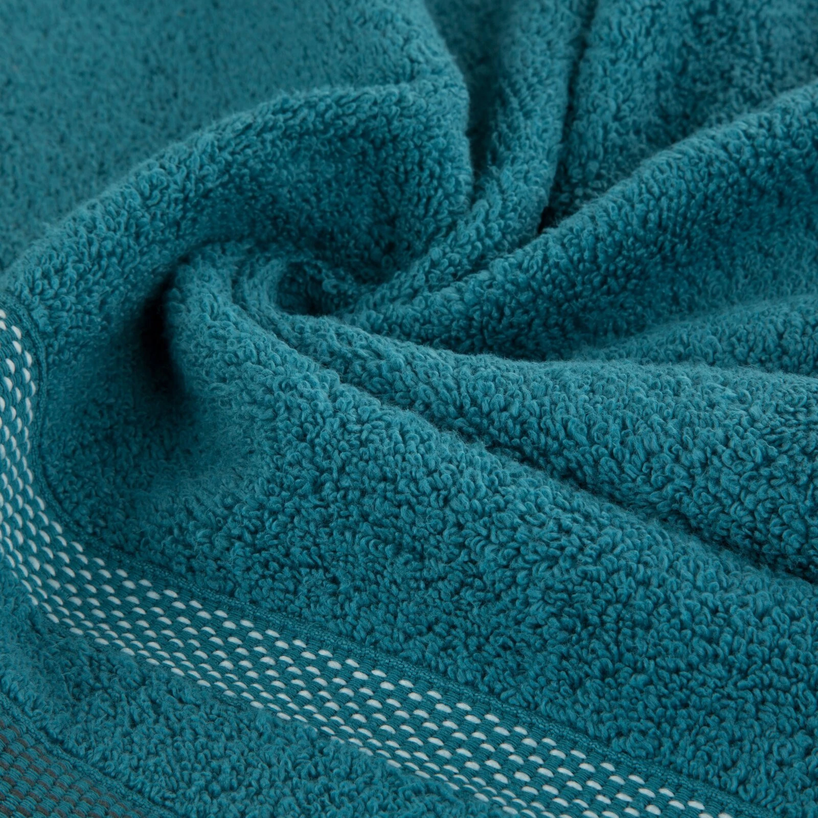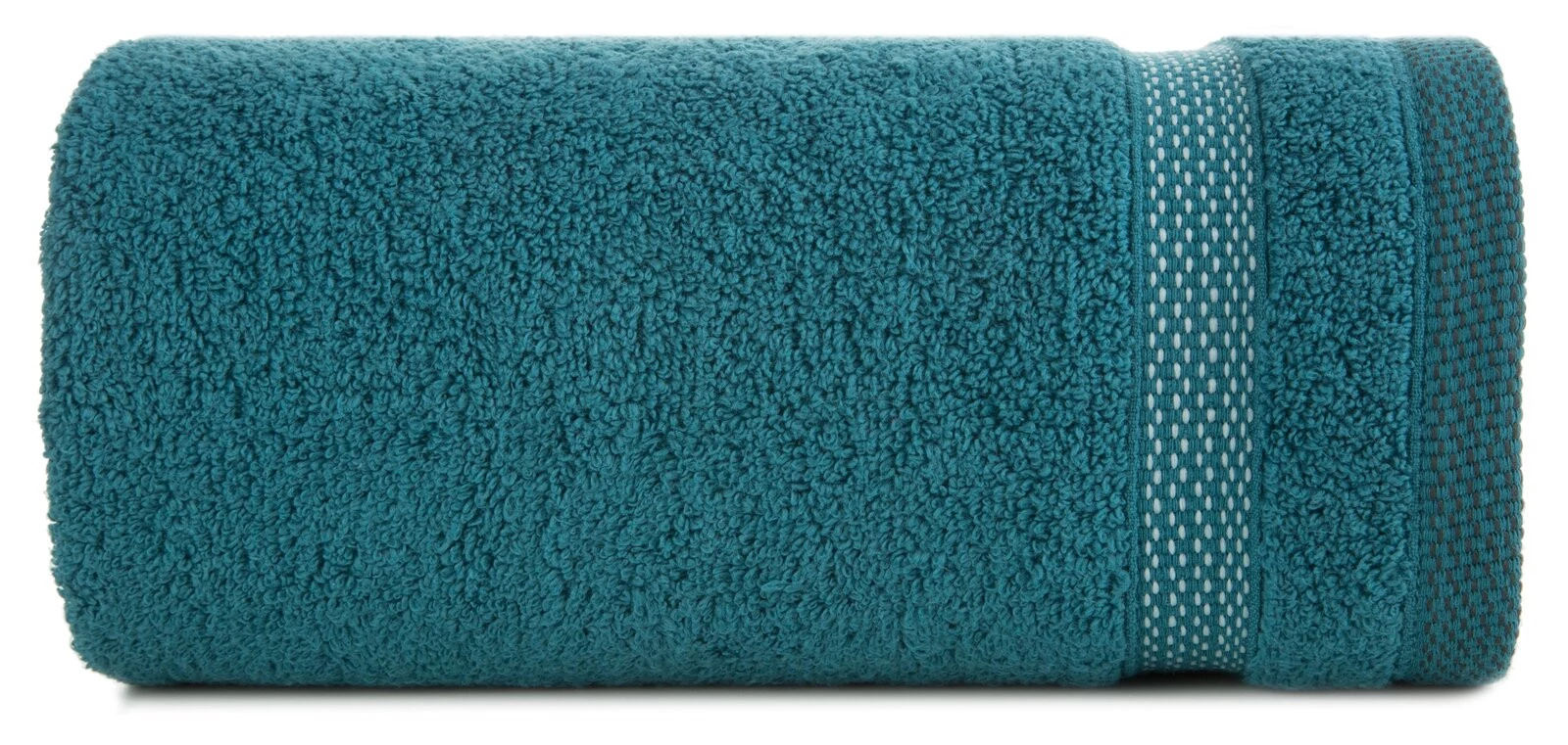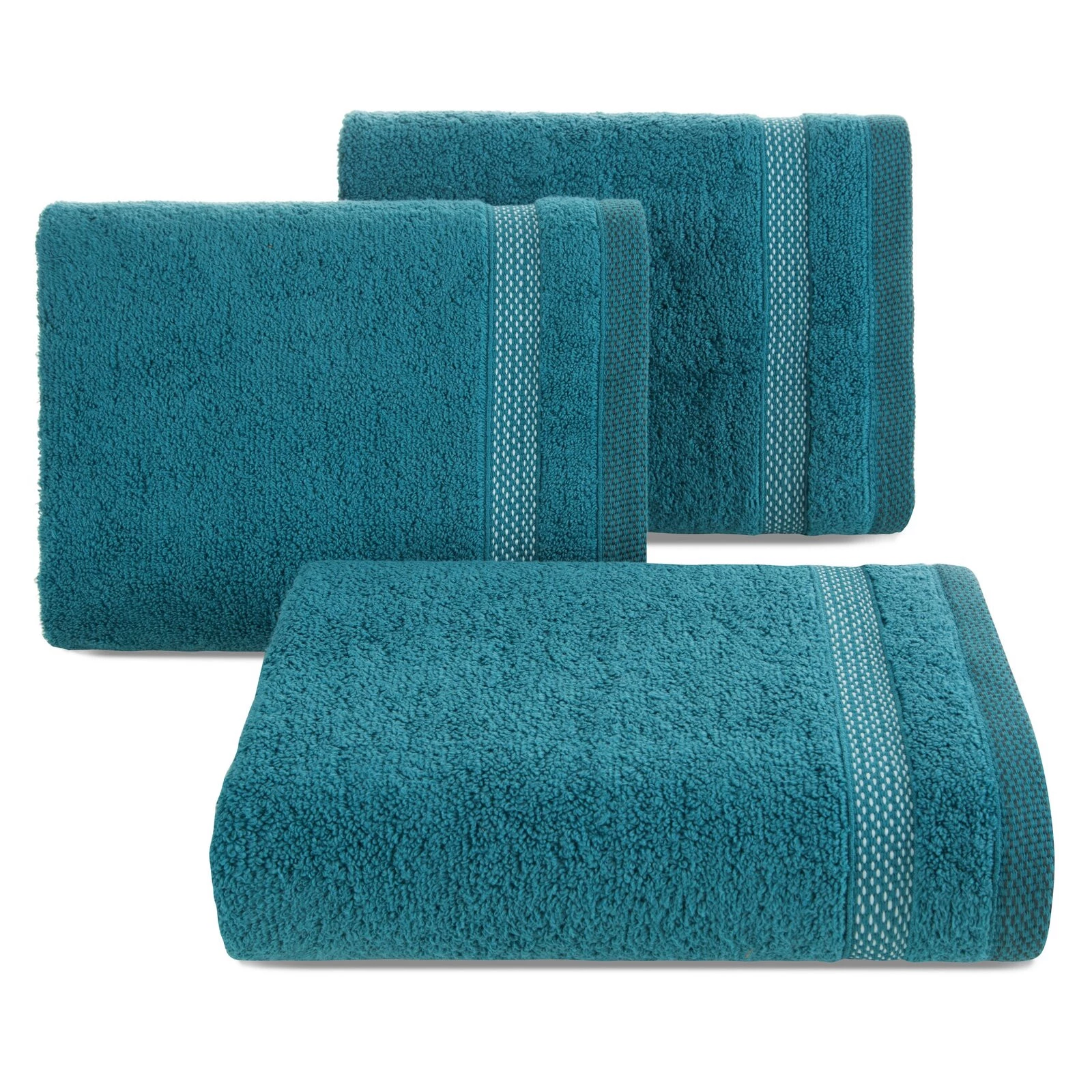 Puszysty i chłonny ręcznik kąpielowy z bawełny frotte o klasycznym charakterze zdobiony elegancką bordiurą w paski z dodatkiem lśniących nici. Łatwy w praniu. szerokość: 70 cm, długość: 140 cm, kolor: morski, Gramatura: 400 GSM, Skład: 100% bawełna; część ozdobna: 50% bawełna, 50% poliester