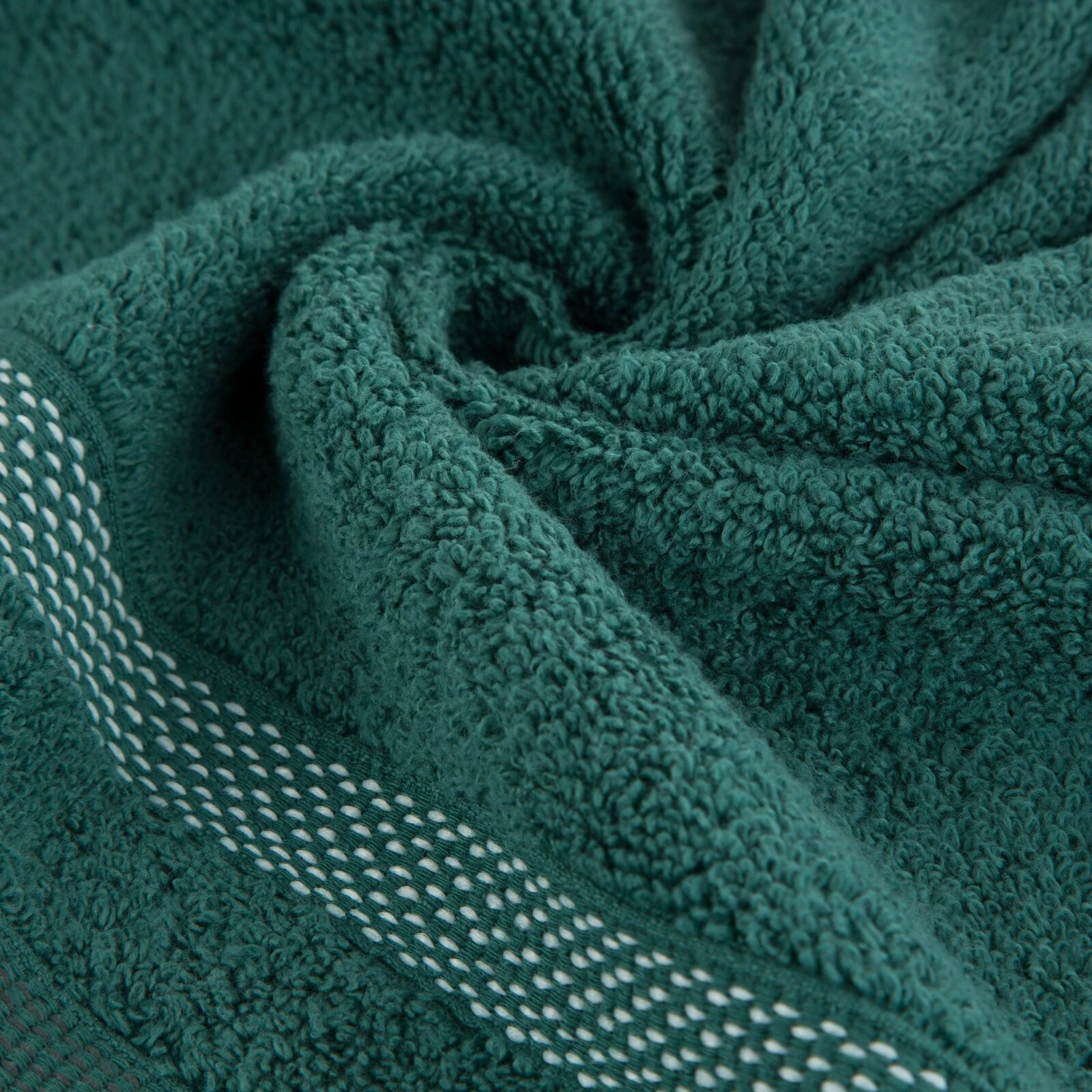 Puszysty i chłonny ręcznik kąpielowy z bawełny frotte o klasycznym charakterze zdobiony elegancką bordiurą w paski z dodatkiem lśniących nici. Łatwy w praniu. szerokość: 70 cm, długość: 140 cm, kolor: ciemnozielony, Gramatura: 400 GSM, Skład: 100% bawełna; część ozdobna: 50% bawełna, 50% poliester
