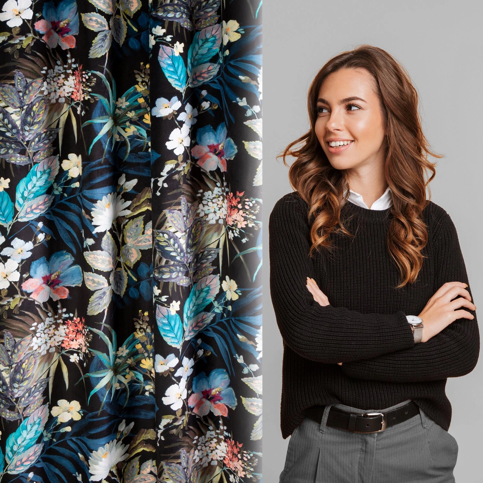 - Zasłona gotowa welwetowa z motywem botanicznym szerokość: 140 cm, długość: 270 cm, kolor: czarny, Gramatura: 200 GSM, Skład: 100% poliester