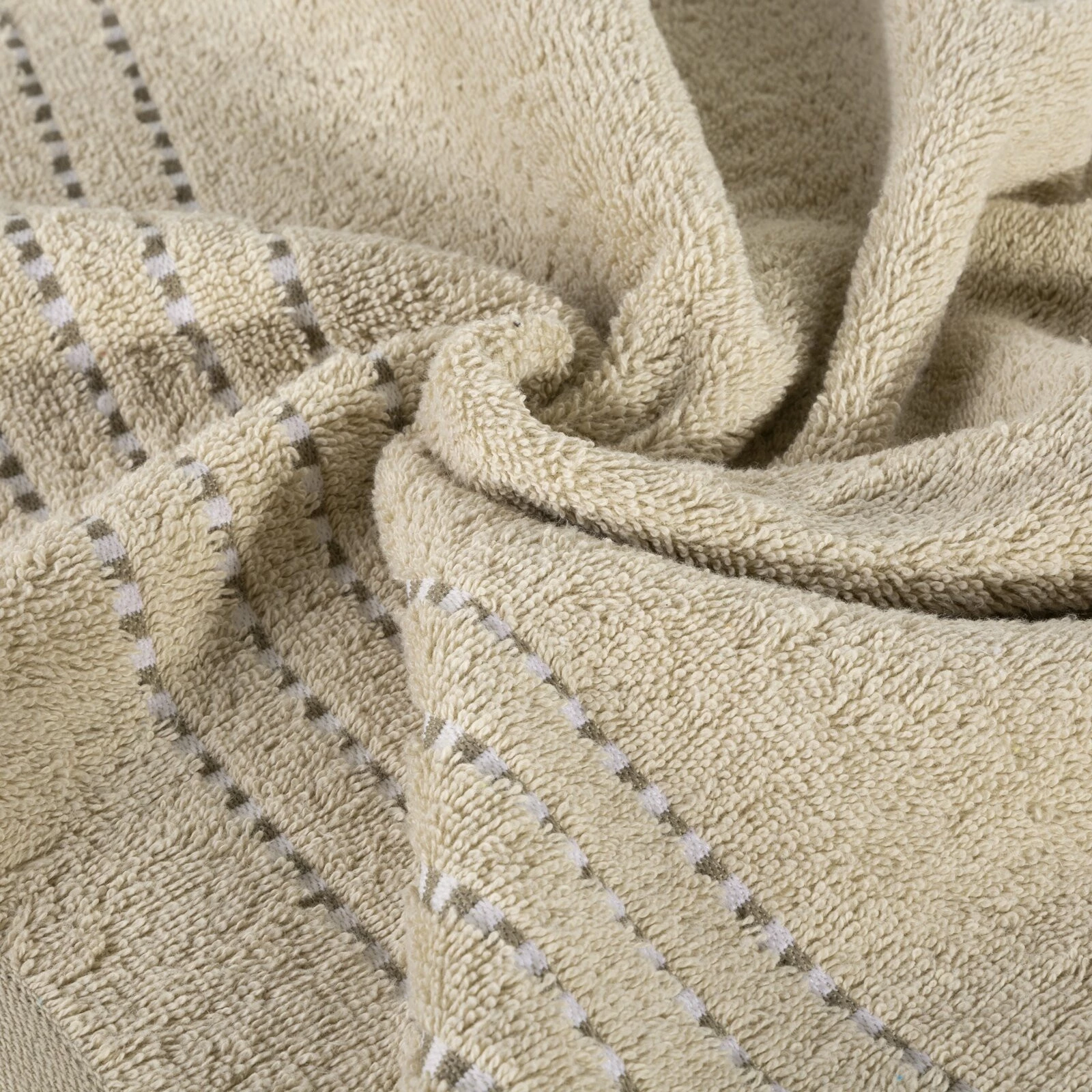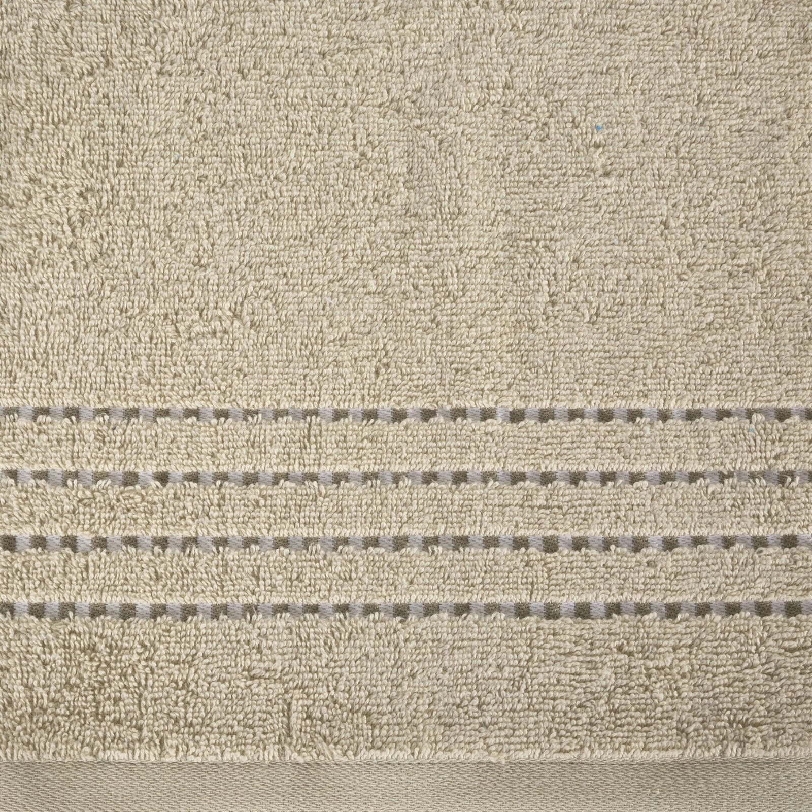 Klasyczny ręcznik kąpielowy z chłonnej tkaniny bawełnianej o splocie frotte. Minimalistyczna bordiura z weluru z dodatkiem lśniącej, metalicznej nici. szerokość: 50 cm, długość: 90 cm, kolor: beżowy, Gramatura: 500 GSM, Skład: 100% bawełna; część ozdobna: 100% poliester