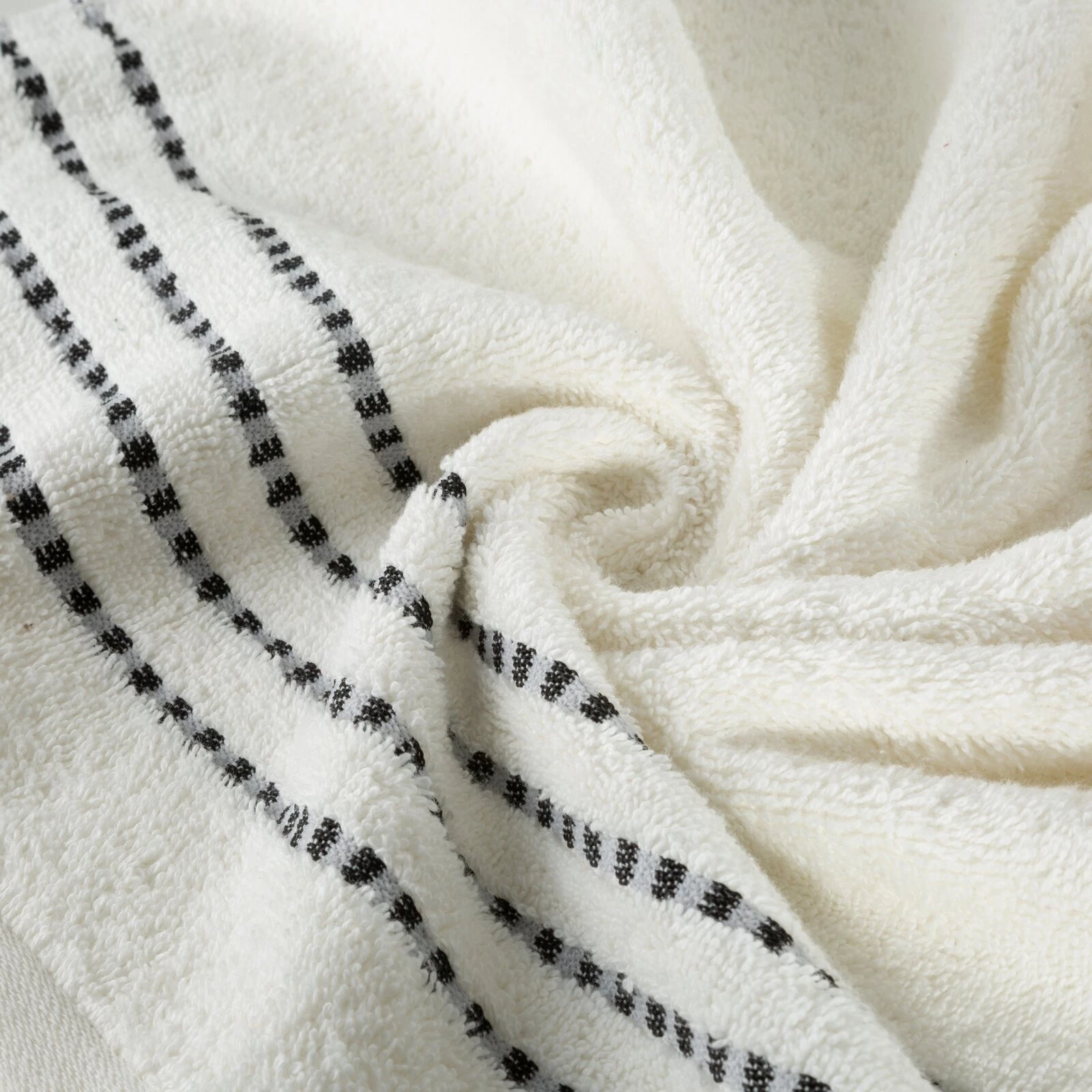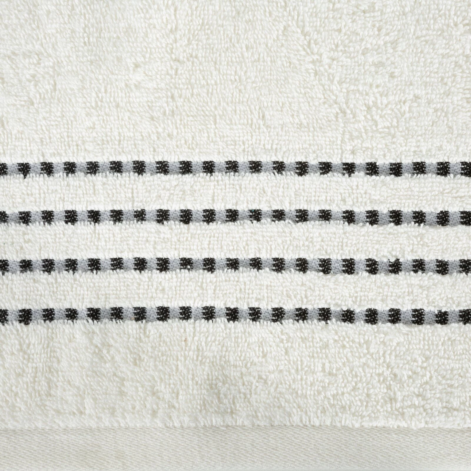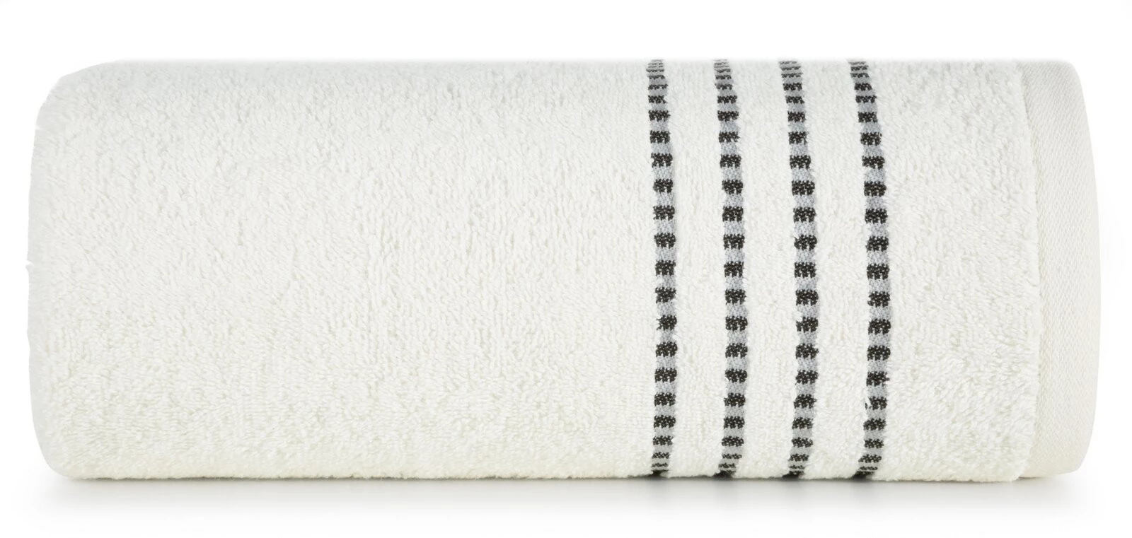 Klasyczny ręcznik kąpielowy z chłonnej tkaniny bawełnianej o splocie frotte. Minimalistyczna bordiura z weluru z dodatkiem lśniącej, metalicznej nici. szerokość: 30 cm, długość: 50 cm, kolor: kremowy, Gramatura: 500 GSM, Skład: 100% bawełna; część ozdobna: 100% poliester