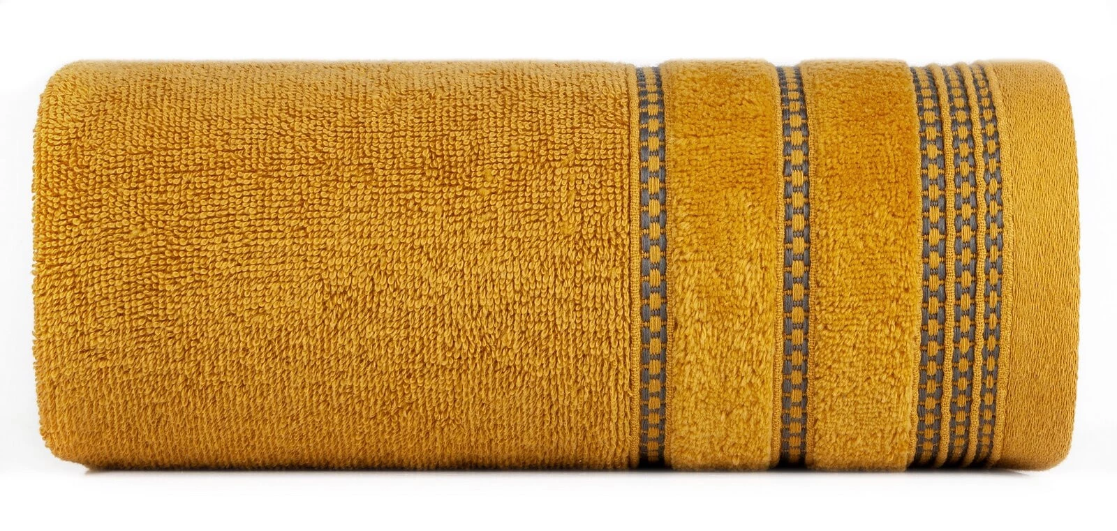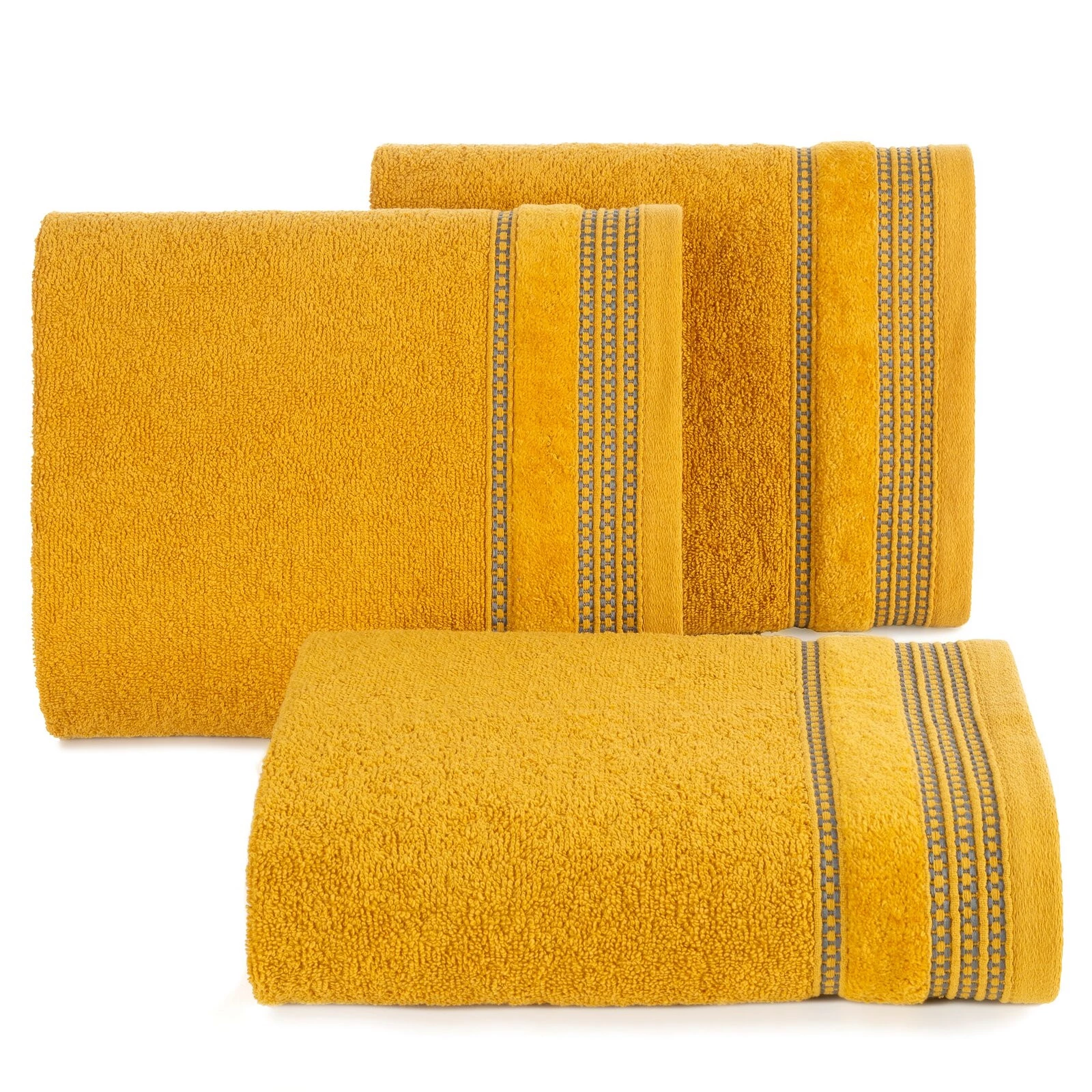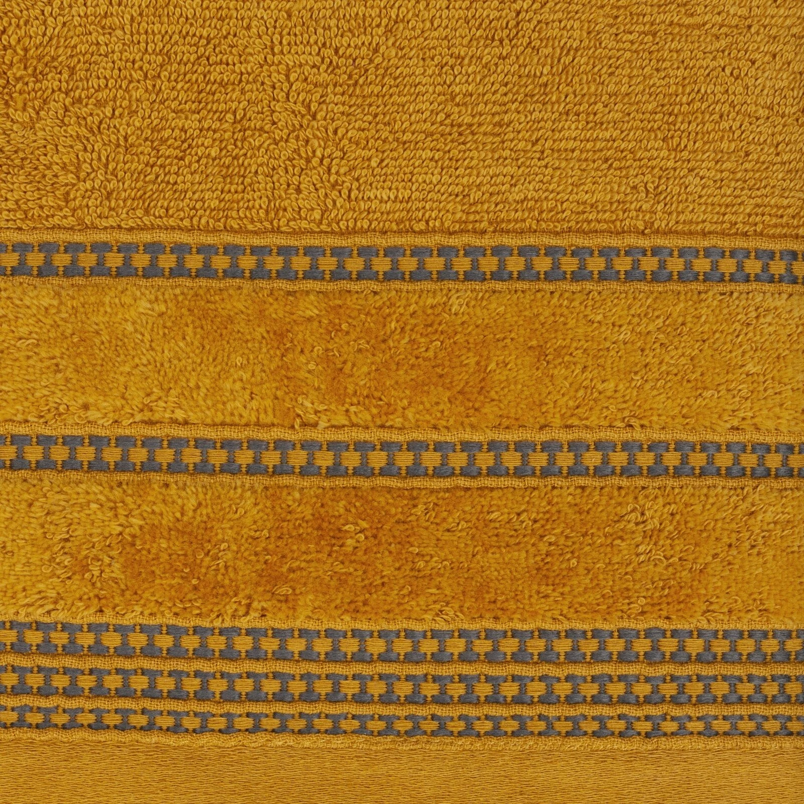 Ręcznik z ozdobną, welurową bordiurą w pasy szerokość: 30 cm, długość: 50 cm, kolor: musztardowy, Gramatura: 500 GSM, Skład: 100% bawełna; część ozdobna: 100% poliester