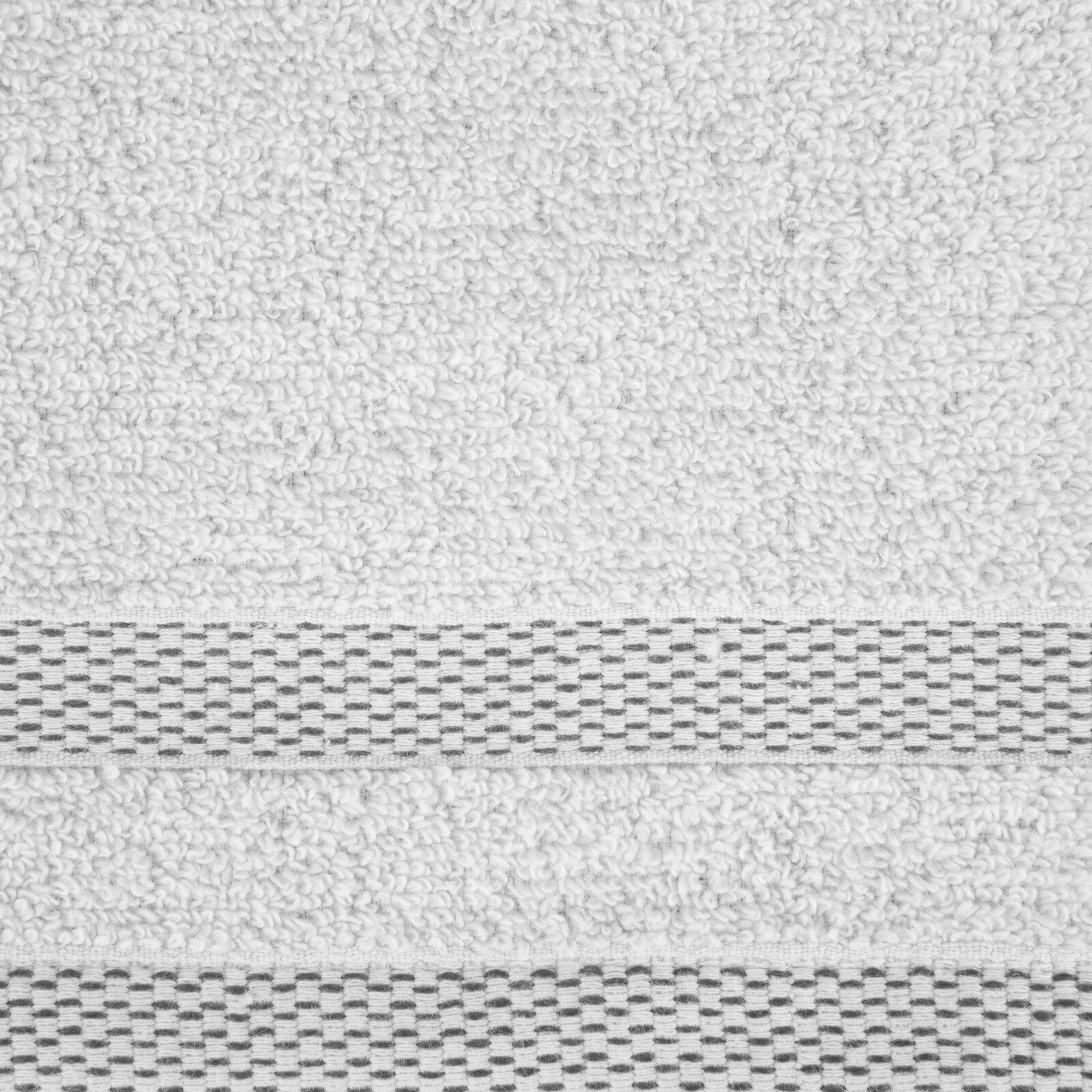 Puszysty i chłonny ręcznik kąpielowy z bawełny frotte o klasycznym charakterze zdobiony elegancką bordiurą w paski z dodatkiem lśniących nici. Łatwy w praniu. szerokość: 50 cm, długość: 90 cm, kolor: biały, Gramatura: 400 GSM, Skład: 100% bawełna; część ozdobna: 50% bawełna, 50% poliester