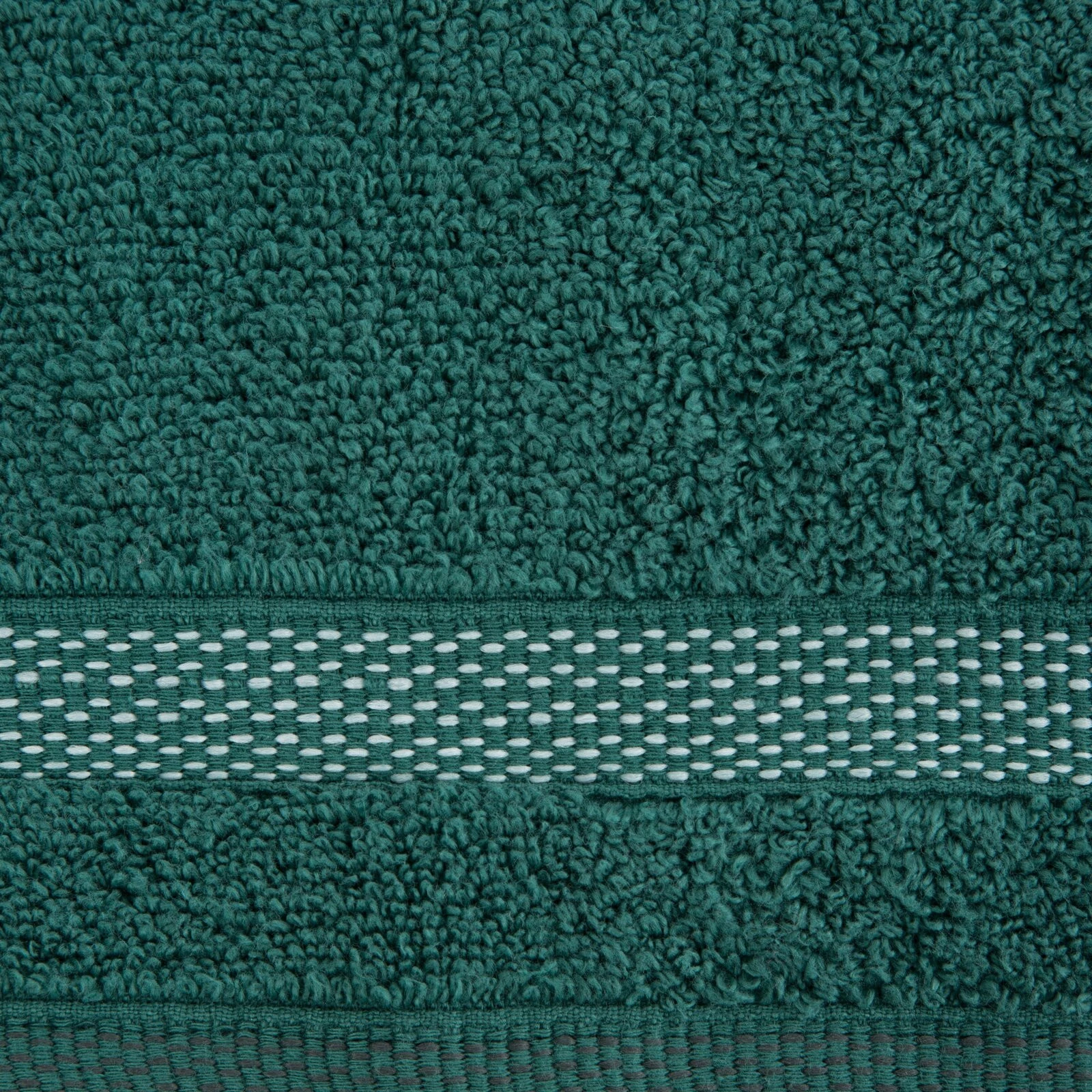 Puszysty i chłonny ręcznik kąpielowy z bawełny frotte o klasycznym charakterze zdobiony elegancką bordiurą w paski z dodatkiem lśniących nici. Łatwy w praniu. szerokość: 50 cm, długość: 90 cm, kolor: ciemnozielony, Gramatura: 400 GSM, Skład: 100% bawełna; część ozdobna: 50% bawełna, 50% poliester