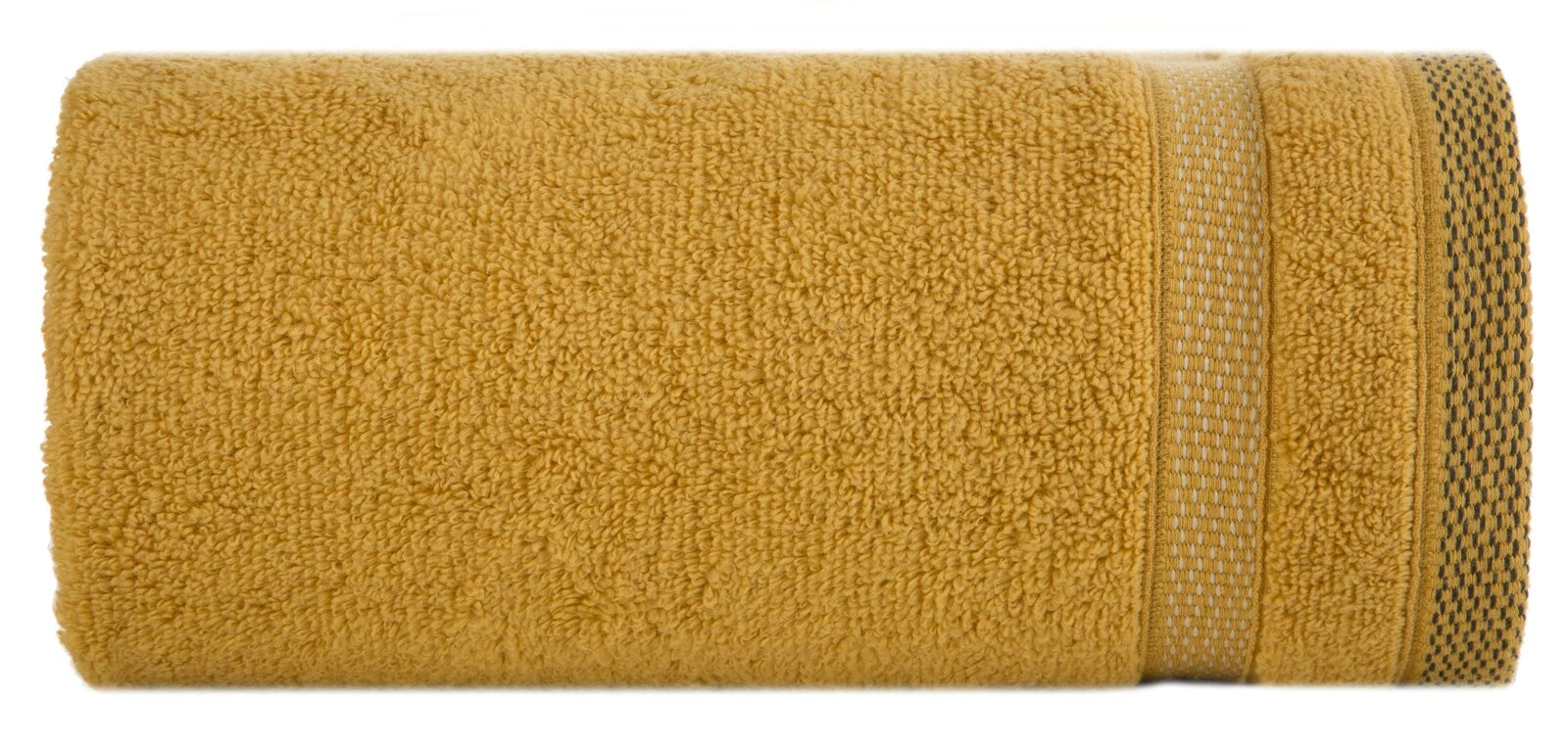 Puszysty i chłonny ręcznik kąpielowy z bawełny frotte o klasycznym charakterze zdobiony elegancką bordiurą w paski z dodatkiem lśniących nici. Łatwy w praniu. szerokość: 70 cm, długość: 140 cm, kolor: musztardowy, Gramatura: 400 GSM, Skład: 100% bawełna; część ozdobna: 50% bawełna, 50% poliester