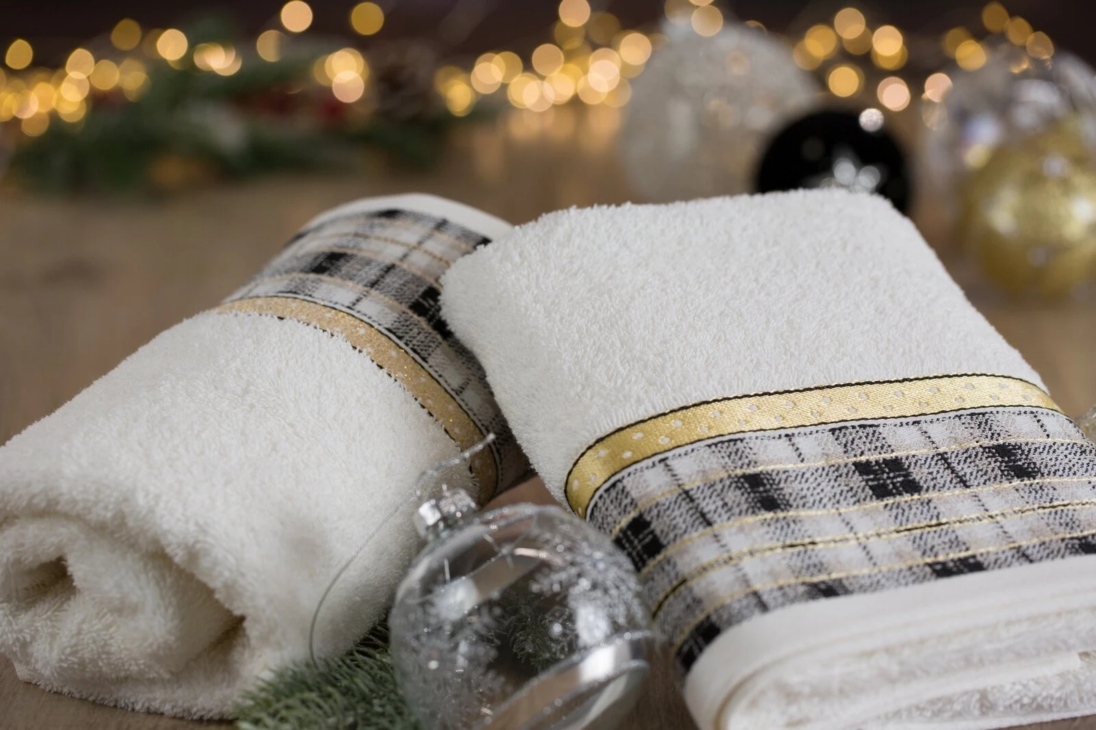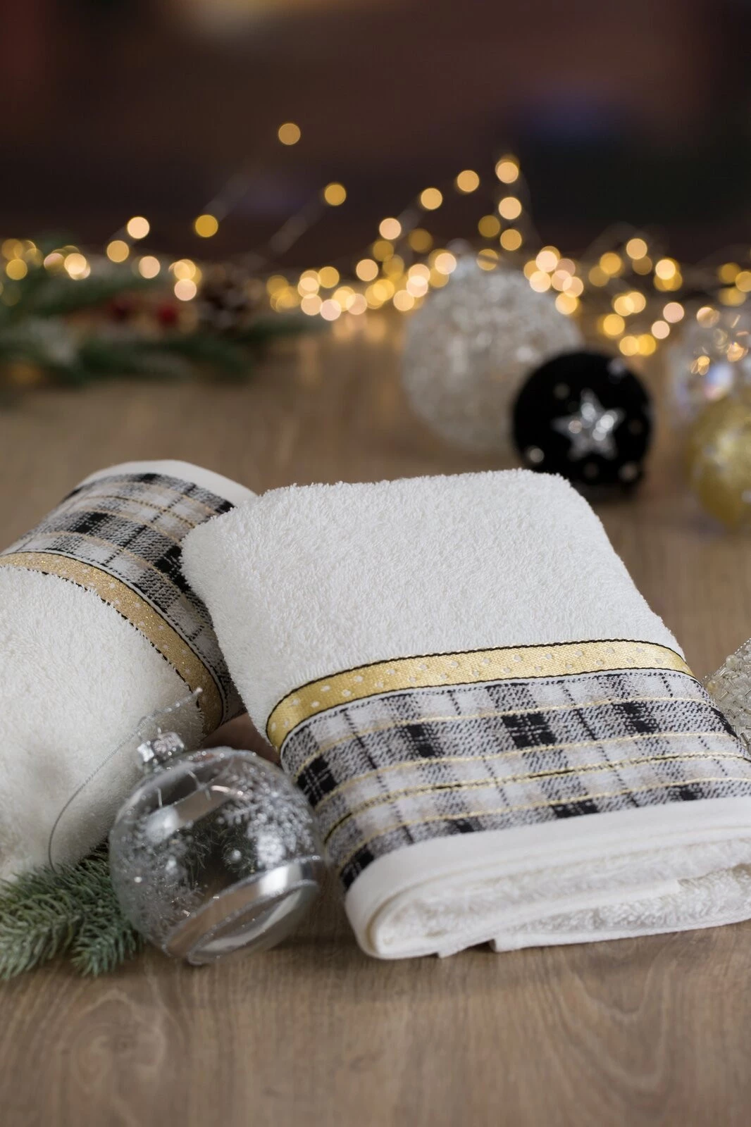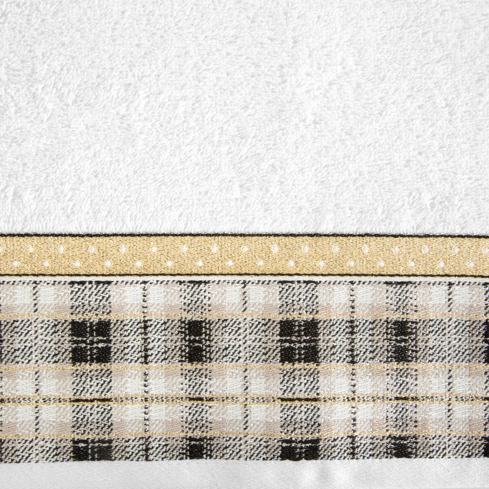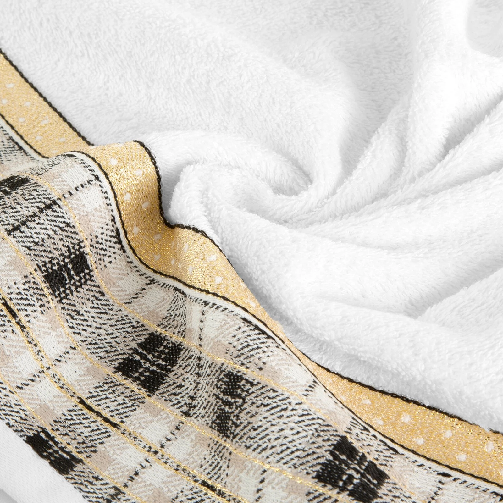 Ręcznik świąteczny z żakardową bordiurą i błyszczącą nicią szerokość: 70 cm, długość: 140 cm, kolor: biały, Gramatura: 480 GSM, Skład: 100% bawełna; część ozdobna: 50% bawełna, 50% poliester