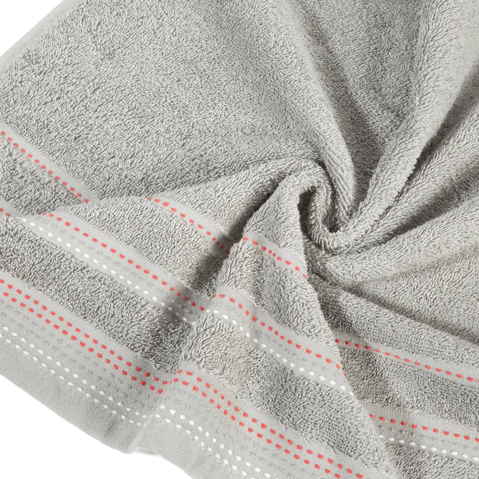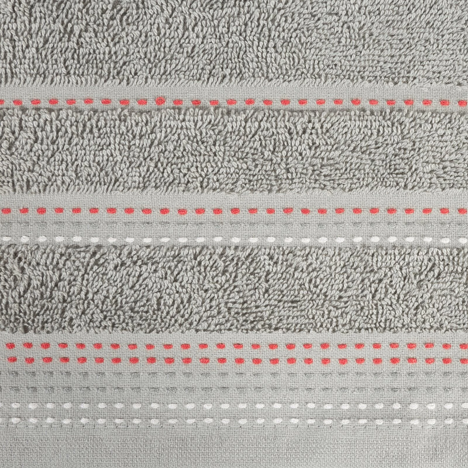 Jednobarwny ręcznik z miękkiej i chłonnej tkaniny bawełnianej o splocie frotte zdobiony kolorową bordiurą w stylu fastrygi. Łatwy w praniu, nie farbuje. szerokość: 70 cm, długość: 140 cm, kolor: popielaty, Gramatura: 500 GSM, Skład: 100% bawełna