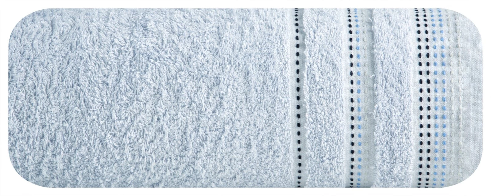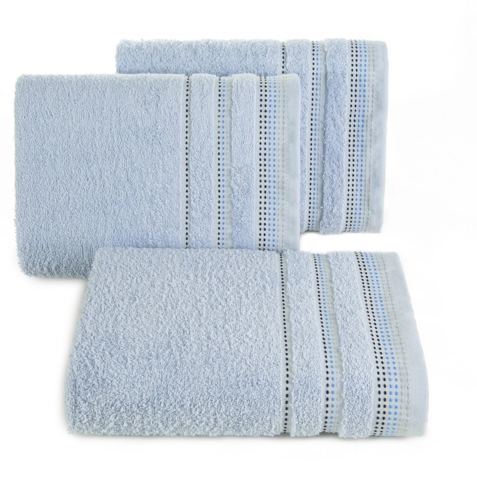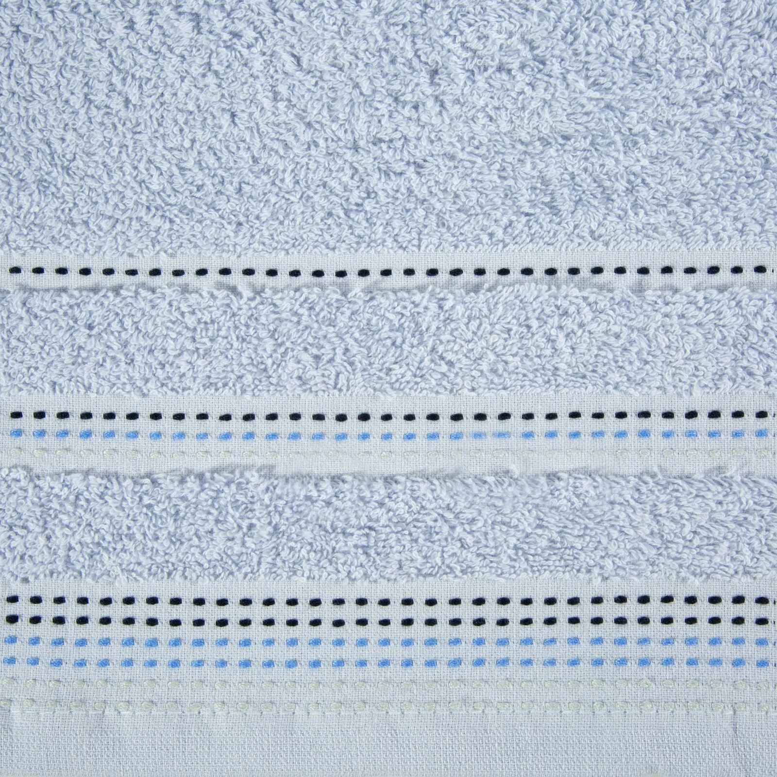 Jednobarwny ręcznik z miękkiej i chłonnej tkaniny bawełnianej o splocie frotte zdobiony kolorową bordiurą w stylu fastrygi. Łatwy w praniu, nie farbuje. szerokość: 50 cm, długość: 90 cm, kolor: niebieski, Gramatura: 500 GSM, Skład: 100% bawełna
