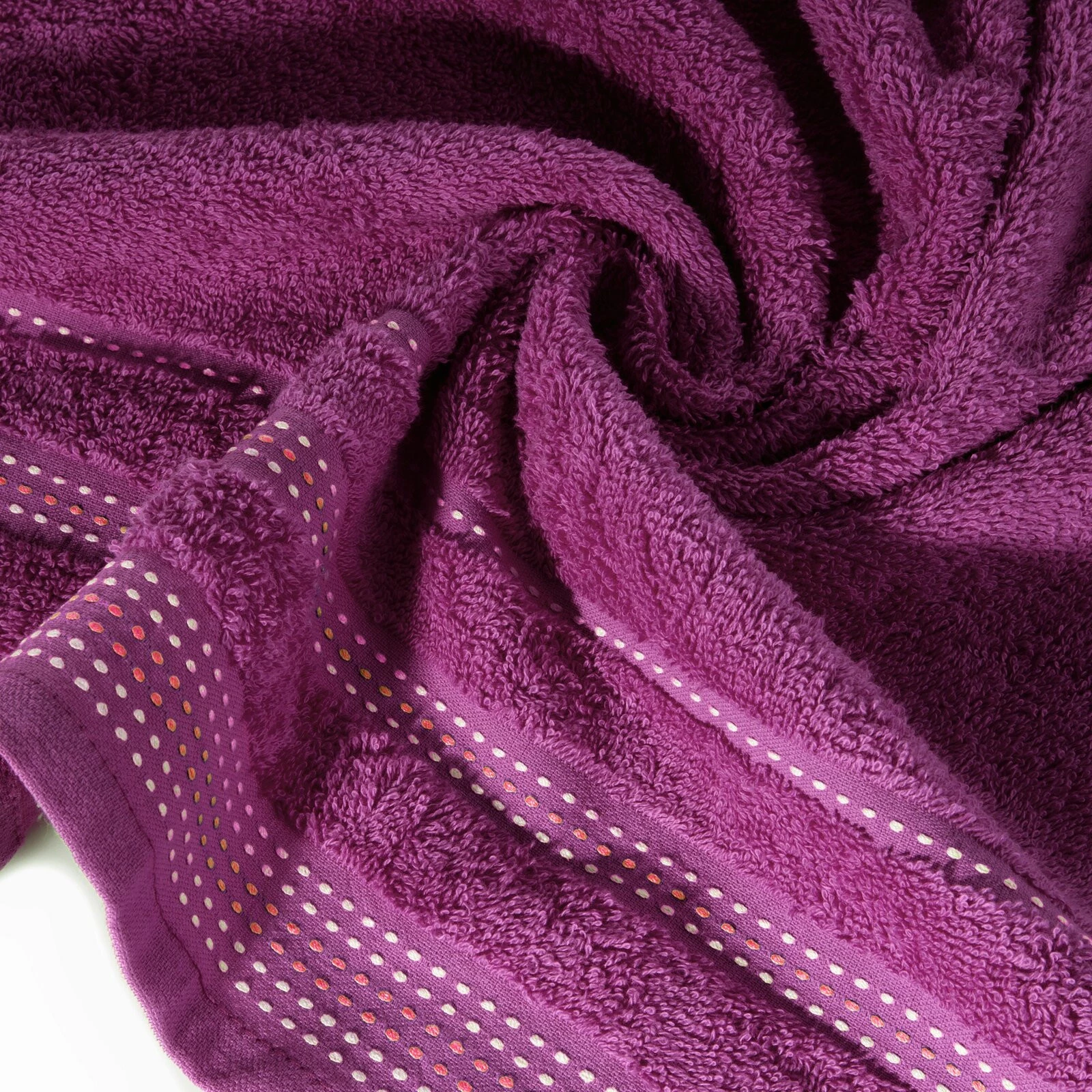 Jednobarwny ręcznik z miękkiej i chłonnej tkaniny bawełnianej o splocie frotte zdobiony kolorową bordiurą w stylu fastrygi. Łatwy w praniu, nie farbuje. szerokość: 50 cm, długość: 90 cm, kolor: fioletowy, Gramatura: 500 GSM, Skład: 100% bawełna