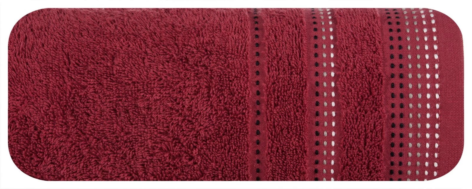 Jednobarwny ręcznik z miękkiej i chłonnej tkaniny bawełnianej o splocie frotte zdobiony kolorową bordiurą w stylu fastrygi. Łatwy w praniu, nie farbuje. szerokość: 30 cm, długość: 50 cm, kolor: bordowy, Gramatura: 500 GSM, Skład: 100% bawełna
