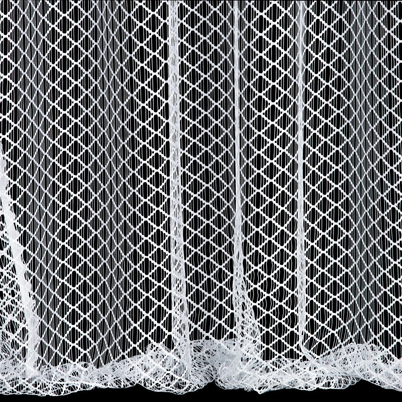 Nowoczesna firana z nieregularnej siateczki o subtelnym połysku i róznej wielkości oczek. Doskonała również w roli dekoracyjnej zasłony. Nie należy wybielać. szerokość: 300 cm, długość: 270 cm, kolor: biały, Gramatura: 75 GSM, Skład: 100% poliester