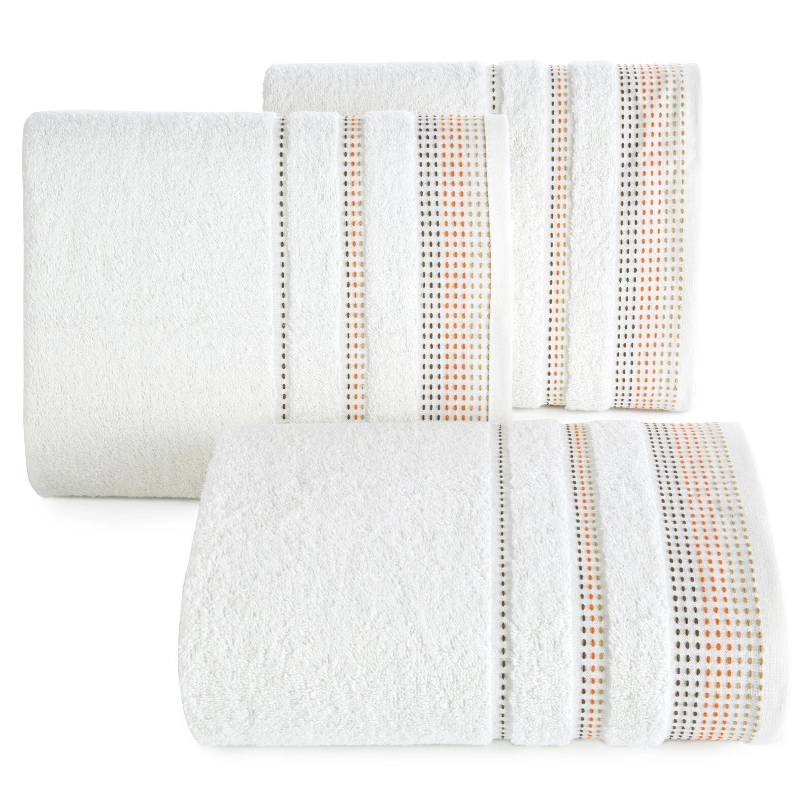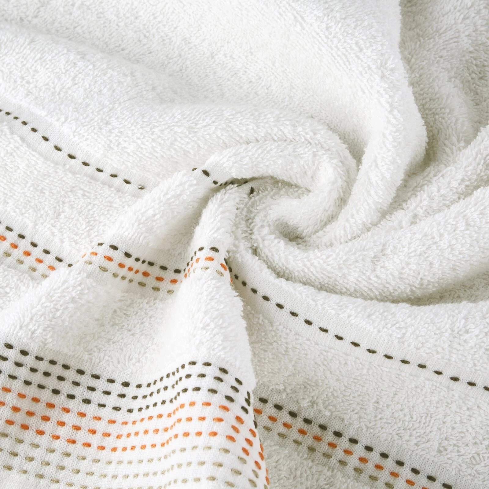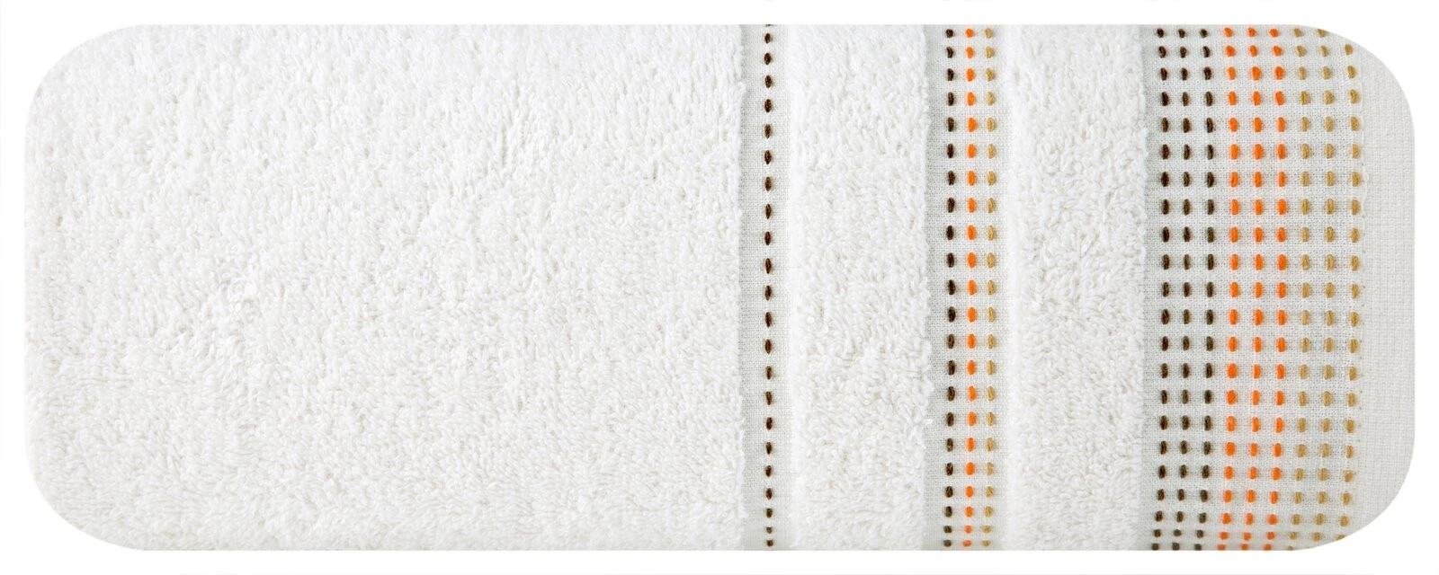 Jednobarwny ręcznik z miękkiej i chłonnej tkaniny bawełnianej o splocie frotte zdobiony kolorową bordiurą w stylu fastrygi. Łatwy w praniu, nie farbuje. szerokość: 50 cm, długość: 90 cm, kolor: kremowy, Gramatura: 500 GSM, Skład: 100% bawełna