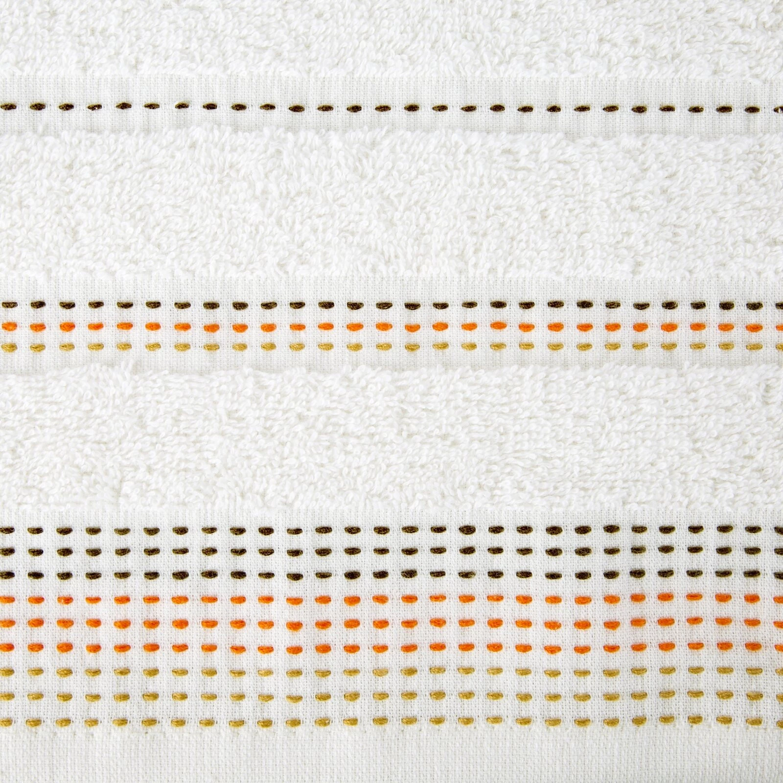 Jednobarwny ręcznik z miękkiej i chłonnej tkaniny bawełnianej o splocie frotte zdobiony kolorową bordiurą w stylu fastrygi. Łatwy w praniu, nie farbuje. szerokość: 70 cm, długość: 140 cm, kolor: kremowy, Gramatura: 500 GSM, Skład: 100% bawełna