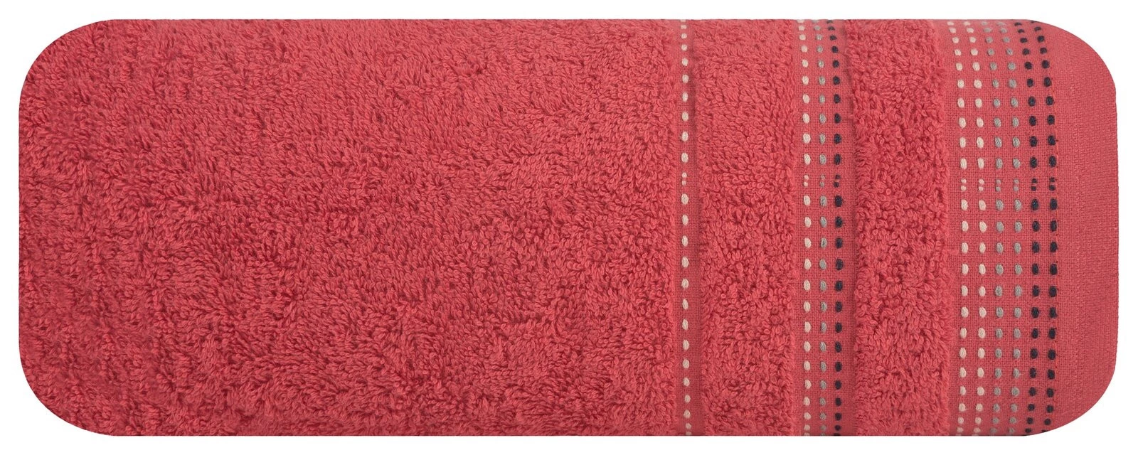 Jednobarwny ręcznik z miękkiej i chłonnej tkaniny bawełnianej o splocie frotte zdobiony kolorową bordiurą w stylu fastrygi. Łatwy w praniu, nie farbuje. szerokość: 50 cm, długość: 90 cm, kolor: czerwony, Gramatura: 500 GSM, Skład: 100% bawełna