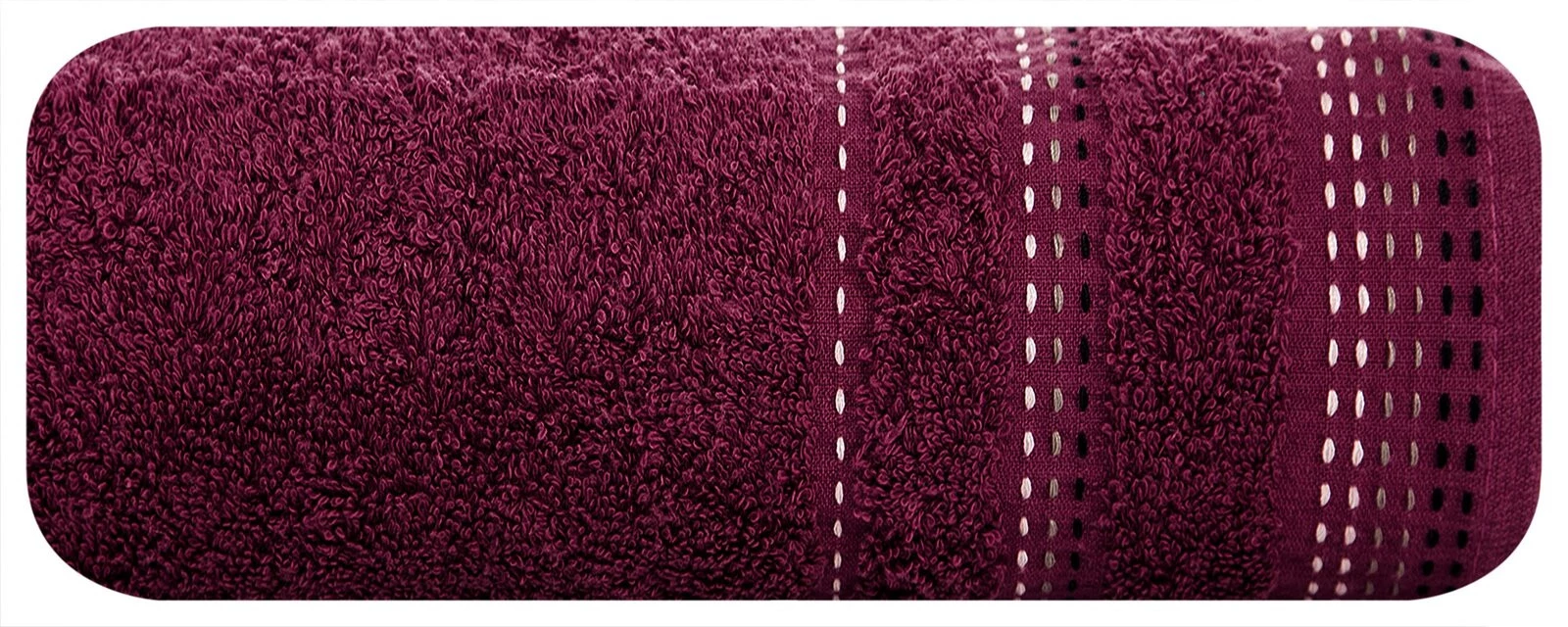 Jednobarwny ręcznik z miękkiej i chłonnej tkaniny bawełnianej o splocie frotte zdobiony kolorową bordiurą w stylu fastrygi. Łatwy w praniu, nie farbuje. szerokość: 50 cm, długość: 90 cm, kolor: fioletowy, Gramatura: 500 GSM, Skład: 100% bawełna