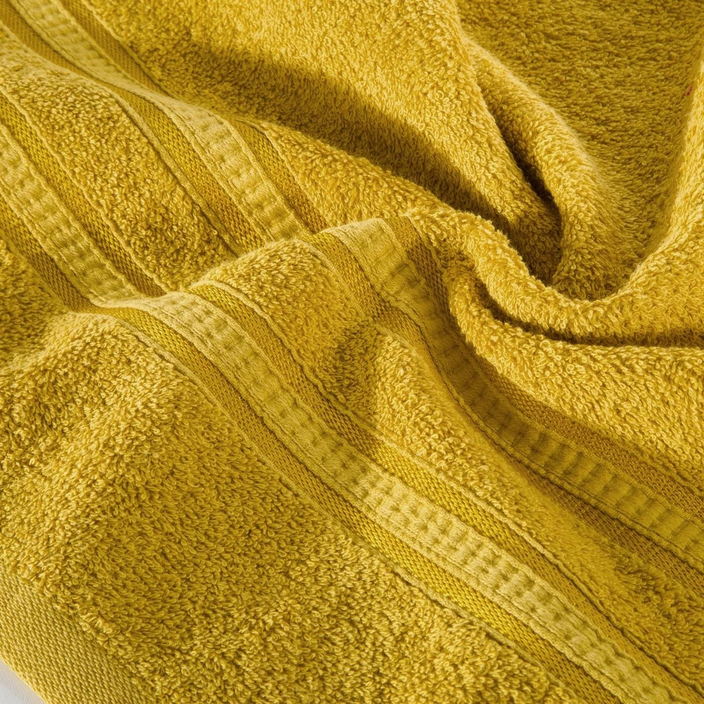 Ręcznik bawełniany z ozdobną bordiurą szerokość: 70 cm, długość: 140 cm, kolor: musztardowy, Gramatura: 500 GSM, Skład: 100% wiskoza z włókna bambusowego; część ozdobna: 100% bawełna