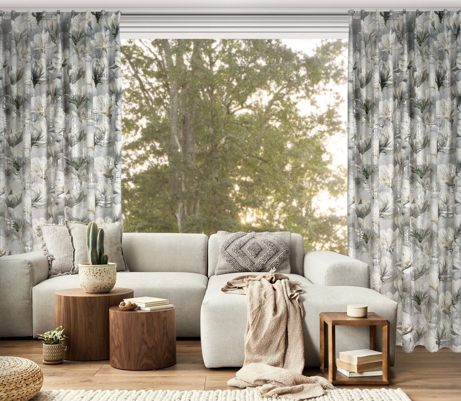 - Zasłona welwetowa ze srebrnym nadrukiem szerokość: 140 cm, długość: 300 cm, kolor: stalowy, Gramatura: 200 GSM, Skład: 100% poliester
