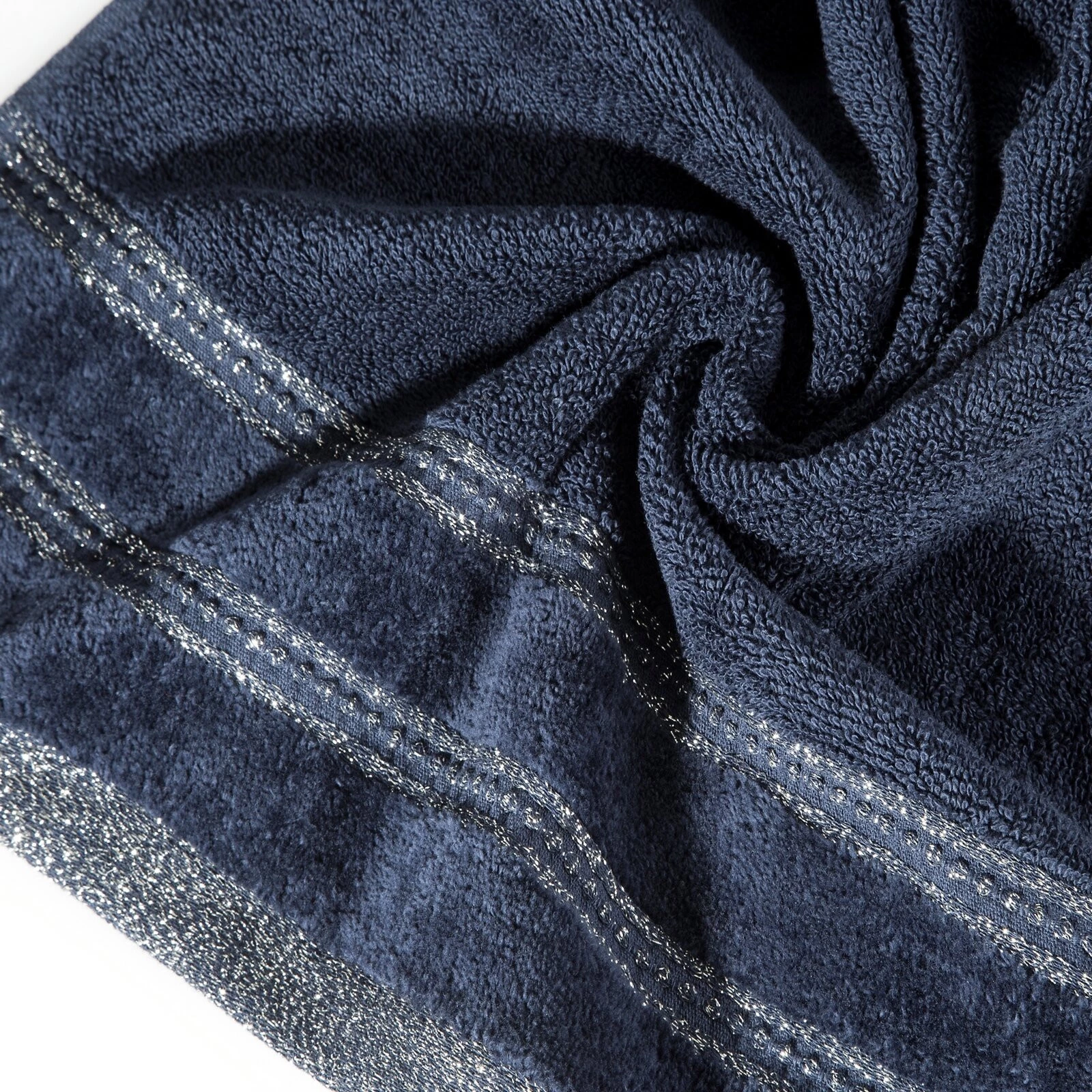 Klasyczny ręcznik kąpielowy z chłonnej tkaniny bawełnianej o splocie frotte. Minimalistyczna bordiura z weluru z dodatkiem lśniącej, metalicznej nici. szerokość: 30 cm, długość: 50 cm, kolor: granatowy, Gramatura: 500 GSM, Skład: 100% bawełna; część ozdobna: 99.2% bawełna, 0.8% nić metaliczna