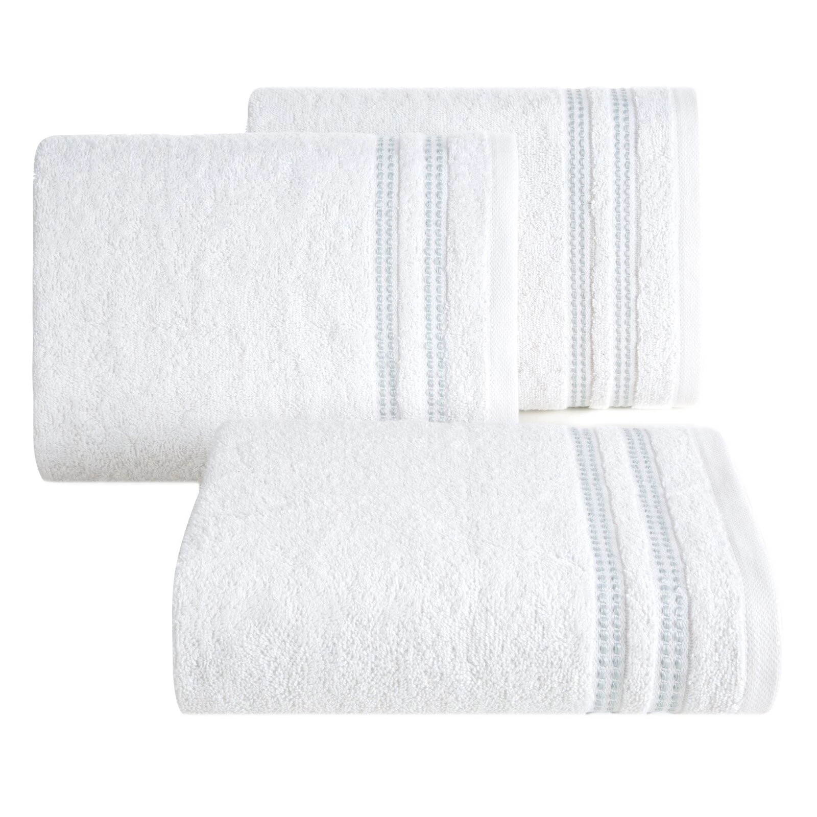 Klasyczny ręcznik kąpielowy z chłonnej tkaniny bawełnianej o splocie frotte. Minimalistyczna bordiura z weluru z dodatkiem lśniącej, metalicznej nici. szerokość: 70 cm, długość: 140 cm, kolor: biały, Gramatura: 500 GSM, Skład: 100% bawełna; część ozdobna: 96% bawełna, 4% poliester